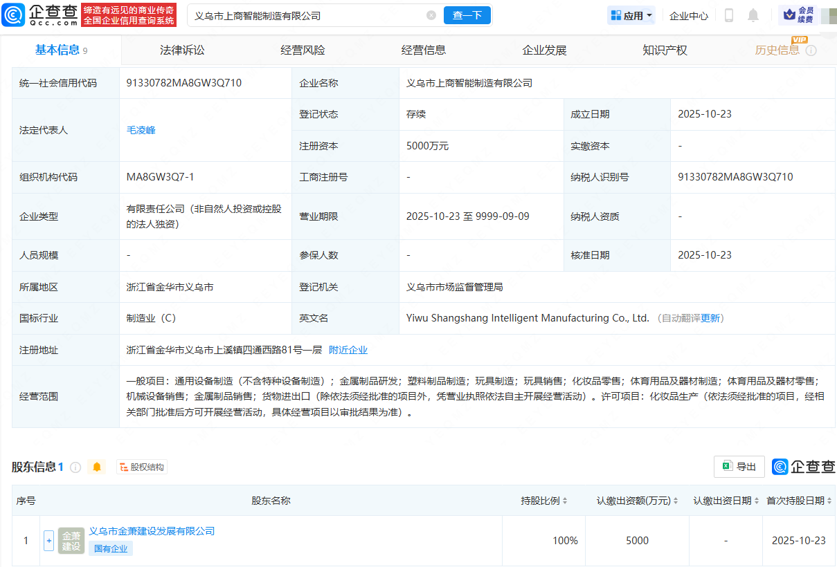 企查查APP显示,近日,义乌市上商智能制造有限公司成立,法定代表人为毛凌峰,注册资本为5000万元,经营范围包含:通用设备制造(不含特种设备制造);金属制品研发;塑料制品制造;玩具制造;化妆品零售等。企查查股权穿透显示,该公司由义乌市金萧建设发展有限公司全资持股。