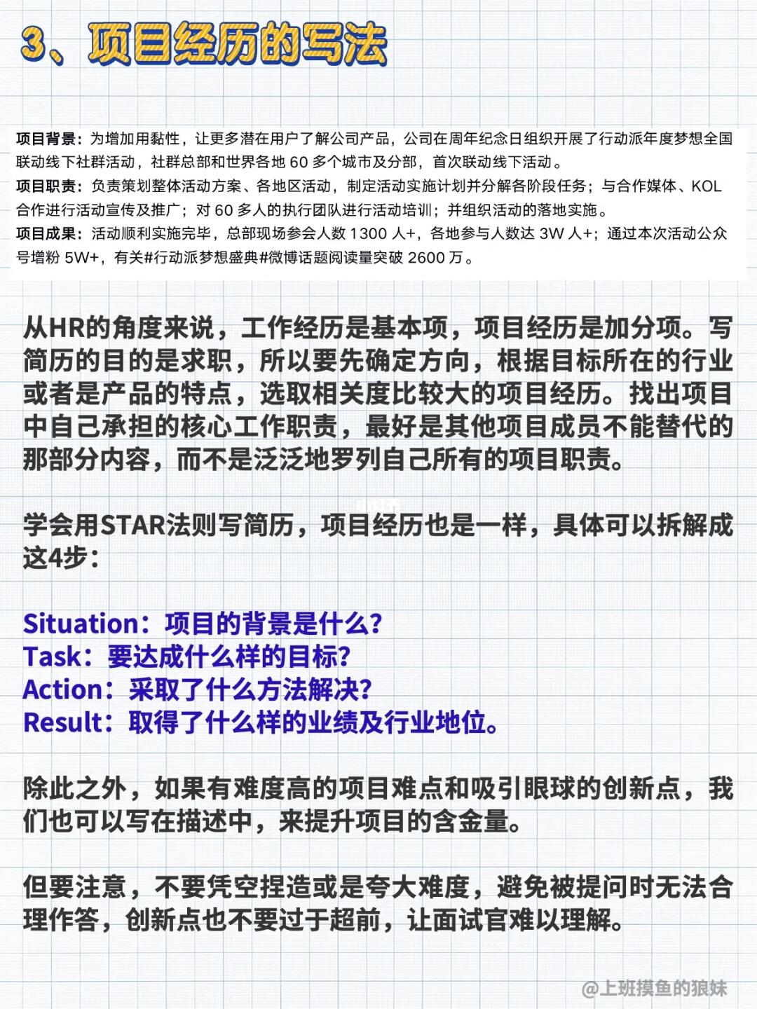 简历的版面是很珍贵的,叙述一定要简洁,要挑选出与职位绩效密切相关的项目,用STAR框架描述: