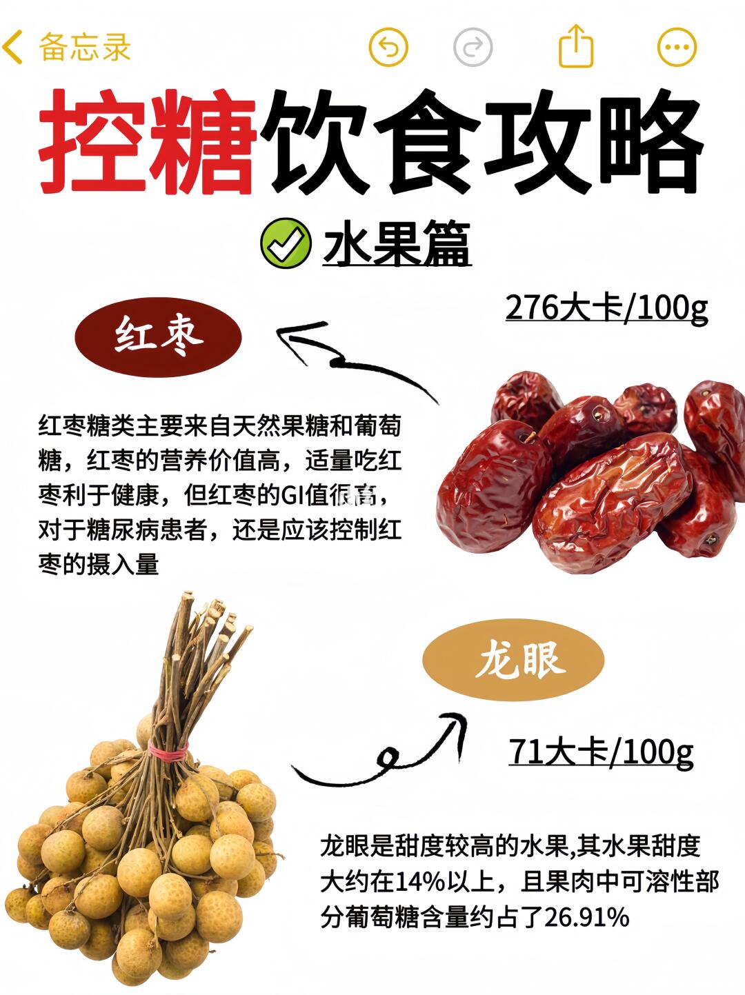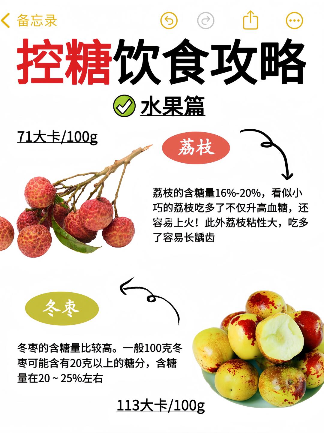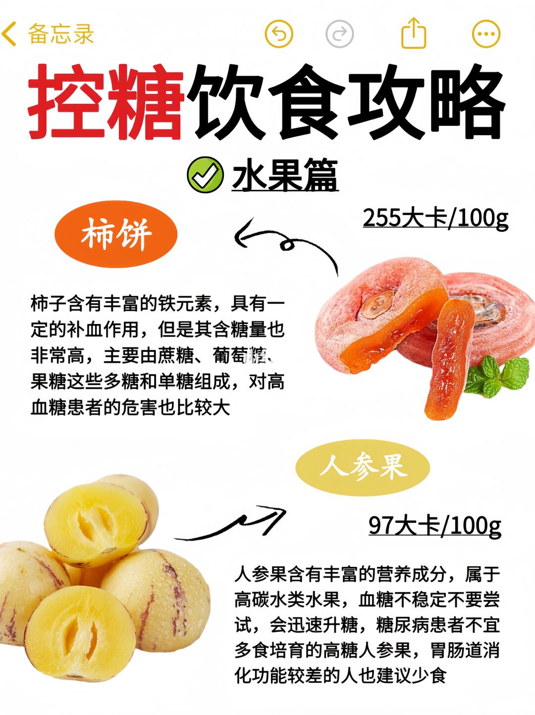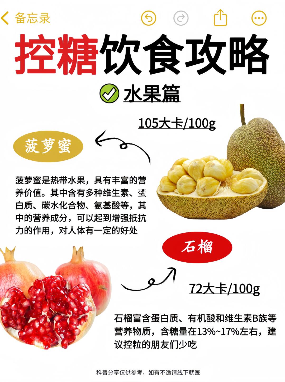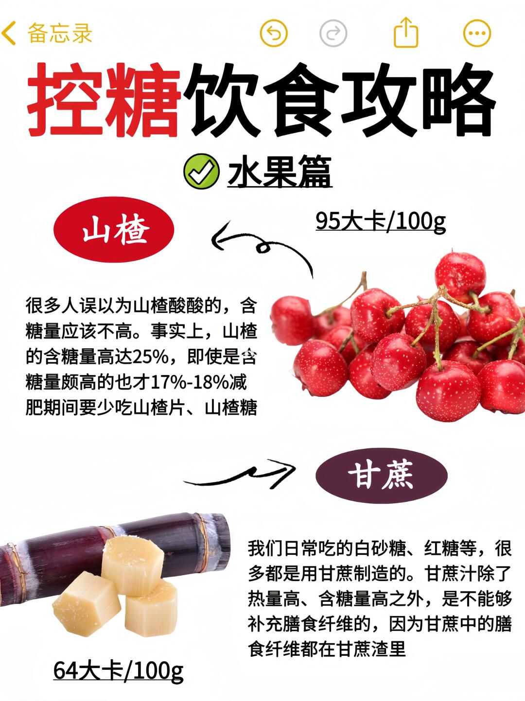 控糖抗衰不要以为拒绝米饭主食吃水果就行了,很多水果糖分高比喝糖还可怕,今天就分享几种高糖水果 · [一R]菠萝蜜 [二R]石榴 [三R]荔枝 [四R]冬枣 [五R]红枣 [六R]龙眼 [七R]山楂 [八R]人参果 [九R]甘蔗 [一R][零R]杮饼 [一R][一R]香蕉 [一R][二R]榴莲
