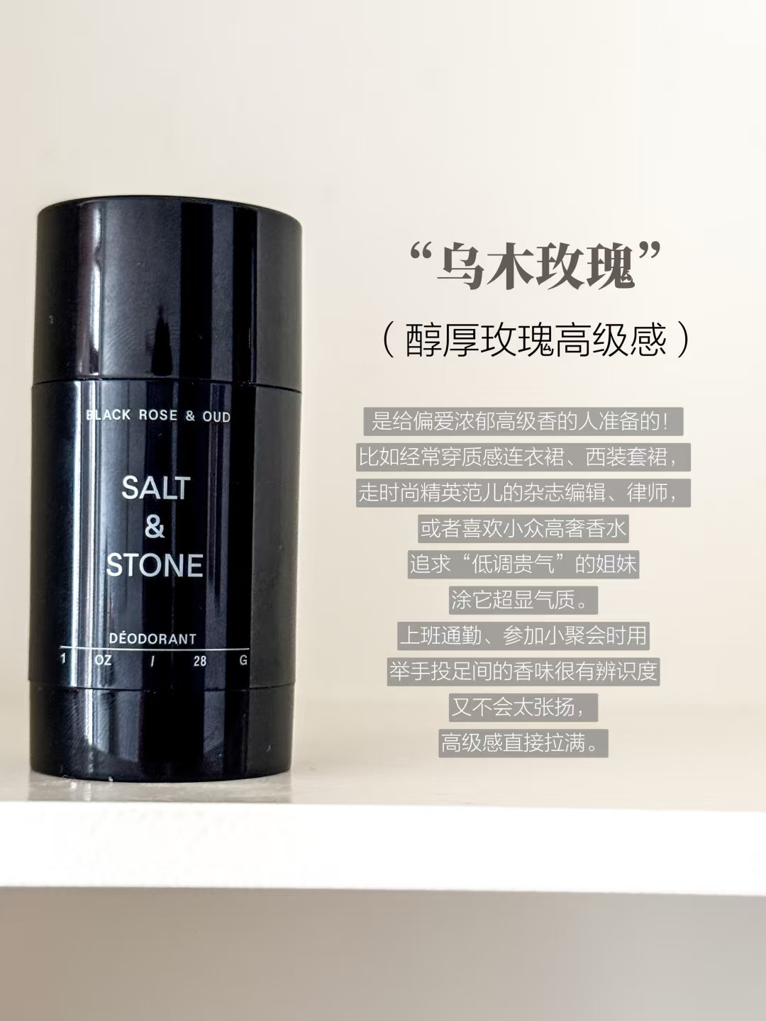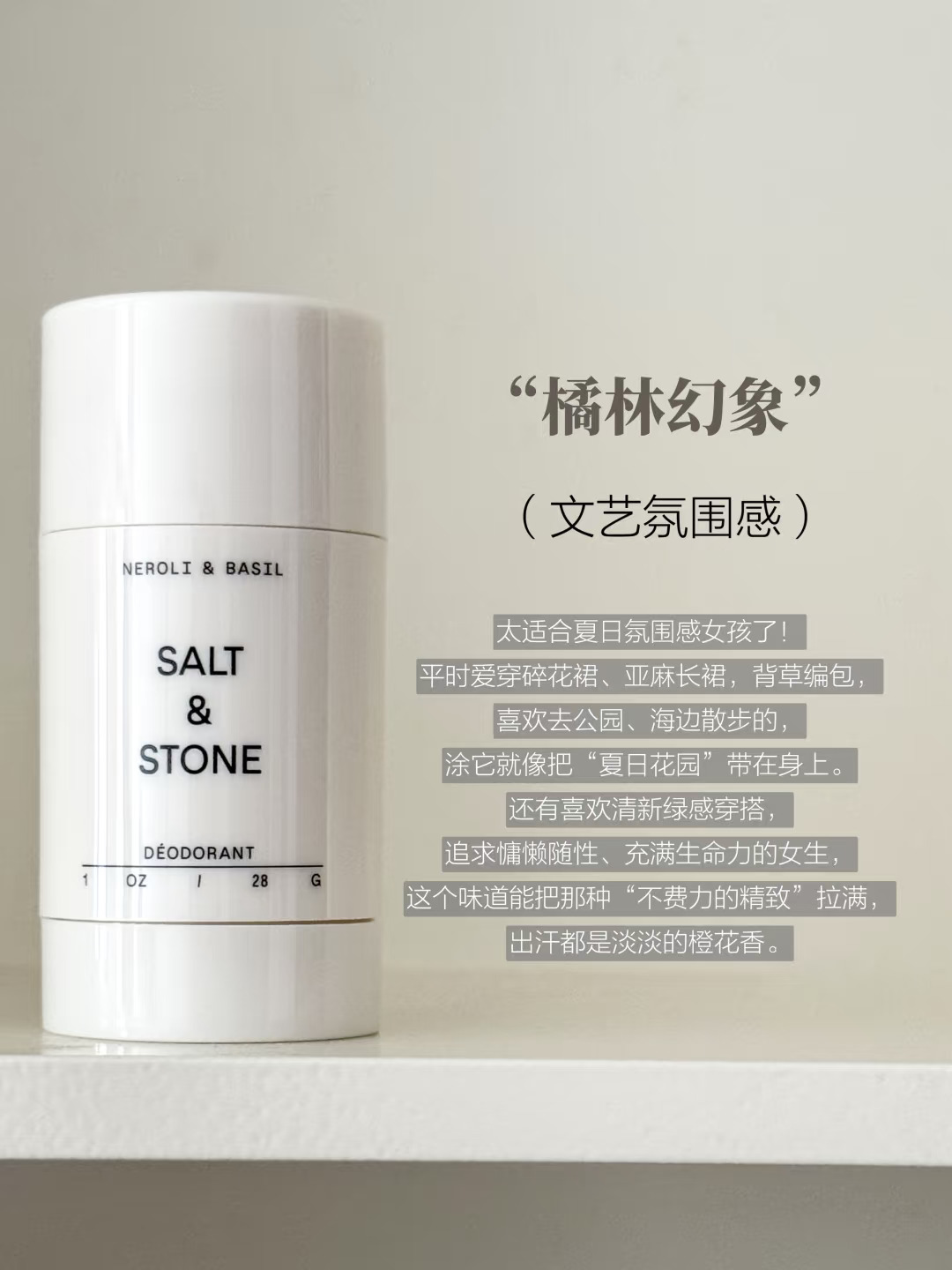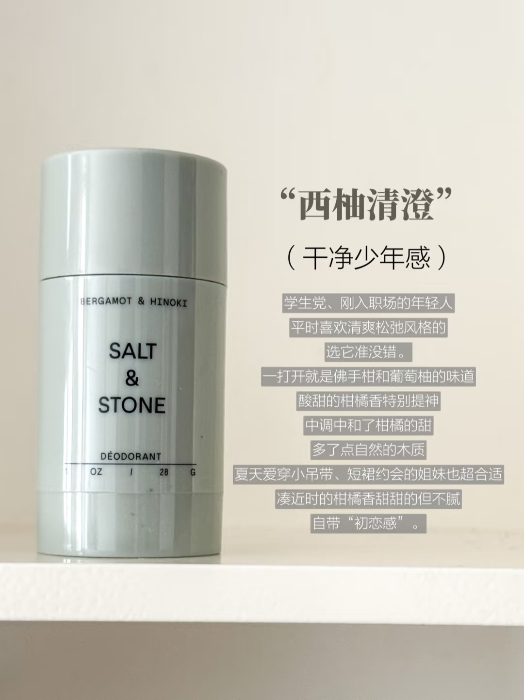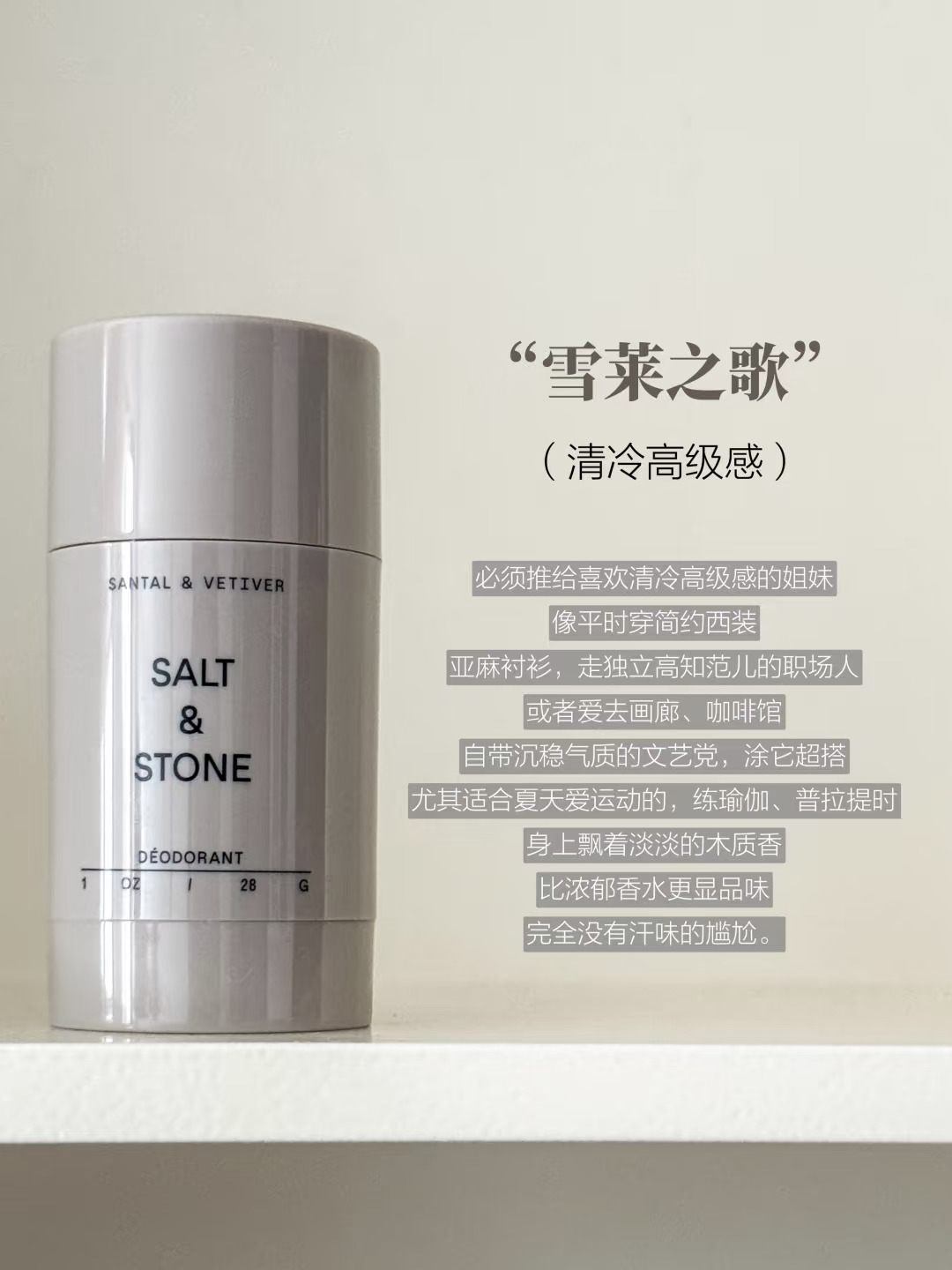 - 挖到宝了!这个香体膏让我夏天出汗都是香的 我夏天真的巨巨巨怕出汗,一出汗不仅黏糊糊,还总担心有味道,直到我买到SALT&STONE的净味香体膏!!它在北美丝芙兰口碑和销量都很能打,还被Vogue杂志评为最好闻的香体膏。 最戳我的是它配方表干净得很,0铝盐0酒精,润润的还不黏腻。关键它不是用浓香盖臭味!是靠益生菌真能分解汗里的异味分子。 昨天我出去逛了仨小时,回来摸腋下还是干爽的,抬手闻闻是淡淡的香,四个味道都巨绝,用完直接自带“伪体香”~四个味道怎么选择适合什么人群都写在图片里了~