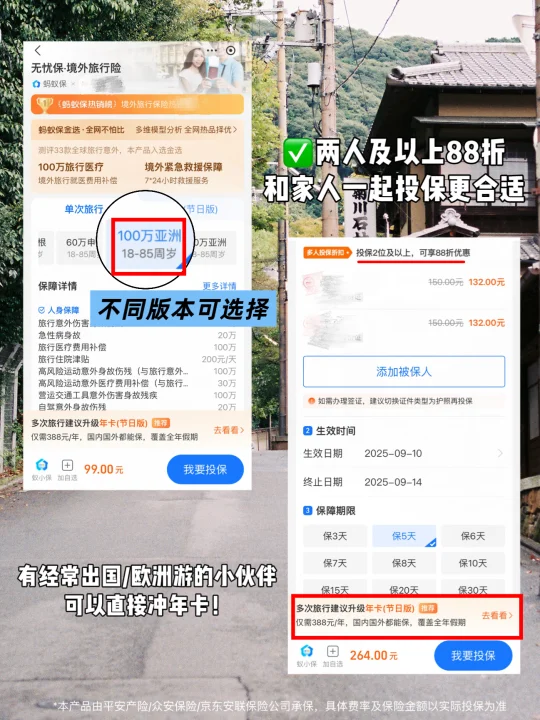 👉打开⽀付宝🔍“境外旅⾏险”,⼤⼈带娃⼀起投保还能打 88 折!