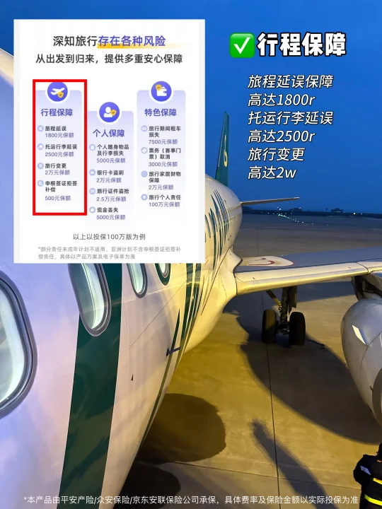 ✈️⾏程保障:航班延误赔付1800元、托运⾏李延误赔付2500元、旅⾏变更赔付2万元