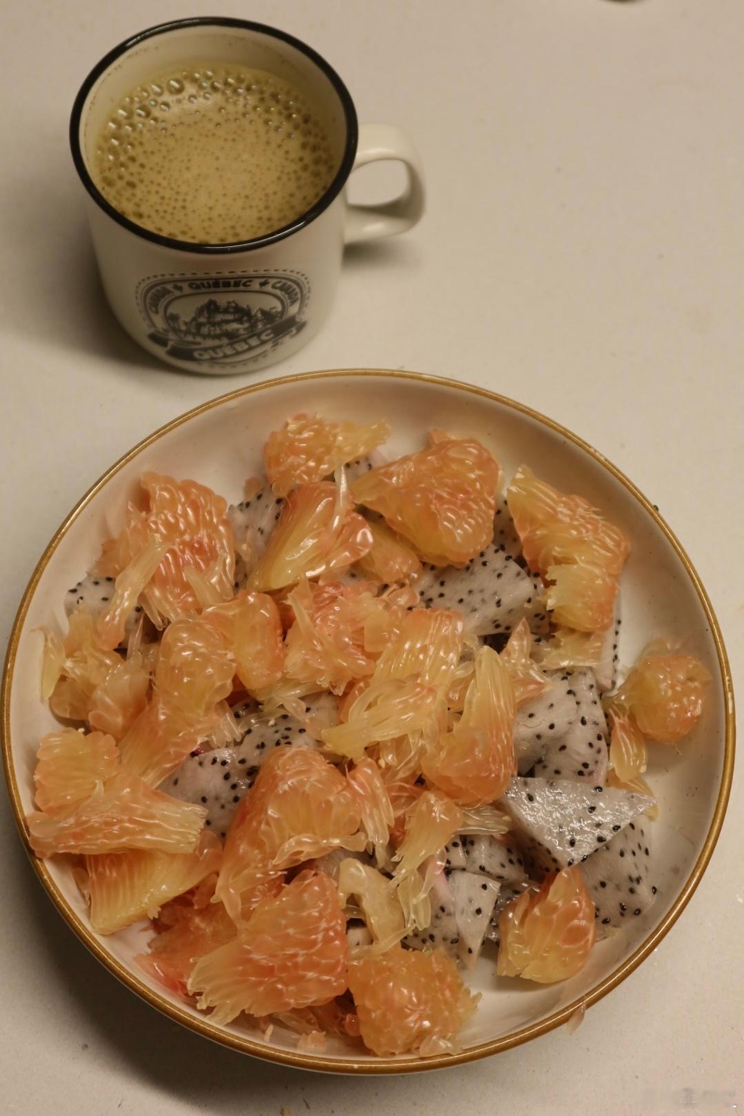 晚餐:因为午餐吃的晚又撑,晚餐只吃了柚子和火龙果配焙茶椰奶拿铁。