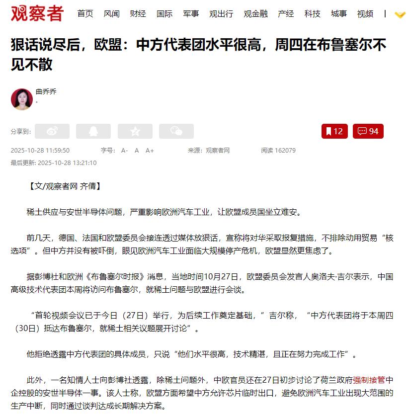 欧盟这脸变得也太快了!前几天还跟着德国、法国一起喊,说要报复中国,连《反胁迫工具法案》这所谓的 “大招” 都搬出来造势,结果没几天就改口,对着媒体夸中国代表团 “水平高、懂行”,还赶紧定了周四(30 号)在布鲁塞尔见面,27 号先开视频会打铺垫,这前后差别跟俩人似的。 德国央行行长纳格尔刚说完 “要强硬报复中国”,转头就补一句 “想找机会谈”;那边法国总统马克龙喊着要用 “核选项” 制裁,欧盟委员会隔天就打电话邀中方去布鲁塞尔面谈。更有意思的是,欧元区刚交出 17 个月新高的 PMI 数据,德国和法国却一个涨得欢、一个跌得惨。 得先说说前阵子欧盟那股 “硬气” 是怎么来的。导火索是中国今年加强了稀土出口管制,尤其是对稀土磁铁相关产品的限制,直接戳中了欧盟的痛处。 稀土这东西可不是普通材料,从手机芯片到新能源汽车电池,再到导弹制导系统,全离不开它,而欧盟 80% 的稀土进口都依赖中国,中国在全球稀土精炼产能中更是占了 80% 以上的份额。 10 月 23 号的欧盟峰会上,法国总统马克龙直接放话,说中国再不松口,欧盟就得动用《反胁迫工具法案》这个 “核选项”,德国也跟着附和,摆出一副要打贸易战的架势。 那个《反胁迫工具法案》听起来挺吓人,号称能加关税、限投资、停政府采购,甚至断资金支持,可实际上这法案去年年底才上线,从来没真正用过,定义还特别模糊,更像是个用来造势的 “纸老虎”。 更有意思的是,欧盟一边喊着报复,一边还在给自家 “挖坑”。荷兰刚强行接管了中国闻泰科技控股的安世半导体,冻结资产又扣押知识产权,德国、法国也在琢磨对欧洲的中企搞更严的监管,要求技术转让不说,还强制要用欧盟的商品和劳动力。 这波操作刚闹起来,欧盟内部先慌了 —— 德国汽车巨头大众、宝马私下急得不行,生产线缺了稀土就得减产,巴斯夫这样的化工企业也离不开亚洲供应链;匈牙利、希腊更是直接反对,毕竟匈牙利靠中欧合作拿了不少基建投资,希腊港口也离不开中国设备,谁也不想真跟中国闹僵。 真正让欧盟 “变脸” 的,还是自家产业快扛不住的现实压力。中国收紧稀土出口后,欧盟新能源汽车价格已经涨了 15%,要是真断供,整个汽车工业都可能出现大范围生产中断。 他们也想过找替代来源,比如跟加拿大、智利、格陵兰合作,甚至推了个 RESourceEU 计划搞回收,但这些都远水解不了近渴 —— 澳大利亚的稀土矿要 2028 年才能投产,格陵兰因为环保问题开采受阻,回收技术也还不成熟。 反观中国,虽然加强了管制,但合规企业的获批率还保持在 85%,不是真的 “封门”,只是要保护战略资源,避免低价流失和环境破坏,这本来就是符合国际惯例的做法。 所以到了 27 号,欧盟态度彻底软了下来。欧盟委员会发言人奥洛夫・吉尔公开说,当天的首轮视频会议为后续工作奠定了基础,还特意夸中方代表团 “水平很高,技术精湛”。 这夸人的背后,其实是欧盟想求中国松口 —— 知情人士透露,他们不光想谈稀土,还盼着中方允许芯片临时出口,生怕汽车工业撑不下去。 毕竟中欧经贸关系根本拆不开,2024 年中欧货物贸易额就有 7320 亿欧元,中国是德国汽车、法国奢侈品的重要市场,真要是启动所谓的 “反胁迫” 措施,欧盟自己的损失只会更大。 更别提欧盟现在还得应付美国的压力。特朗普政府对欧洲发动贸易战,要对汽车等商品加征 25% 关税,还在政治上干涉欧洲内政,支持极右翼政党,这让欧盟感受到了前所未有的孤立。 本来就自绝于俄罗斯能源,现在再跟中国闹掰,等于把自己的经济后路全堵死了。西班牙外长都坦言,“欧洲的对华政策必须自己做决定”,不能盲目跟在美国后面。这种内外交困的处境,让欧盟根本没底气真跟中国对抗,之前的硬气表态更像是给自己壮胆的政治表演。 从喊着报复到赶着见面,欧盟这波 “变脸” 其实藏着最实在的利益算计。30 号布鲁塞尔的会谈,本质上是欧盟想通过谈判解决供应链危机,毕竟中国手里的稀土牌太关键,而他们自己的产业短板短期内补不上。 说到底,在全球化的产业链里,对抗从来不是出路,合作才是互利共赢的正道,这大概就是欧盟急着转态度的根本原因。 信源:中华网