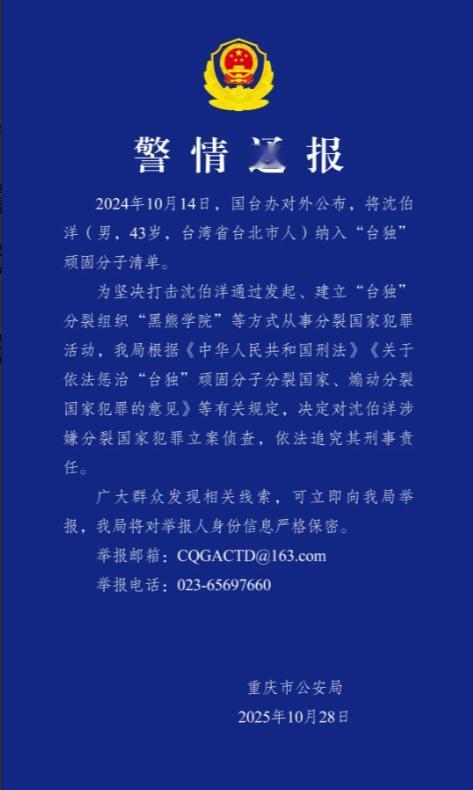 当时缅北的通缉,大家也觉得无法落实,但现在,你都看到结果了。 还有前几天被通缉的那些个网军,想去台湾的银行办房贷都被拒了,理由自然是正在被通缉,风险巨大。 所以,一旦实质性动作开始之后,接下来就是各种精准打击,各位等着看好戏吧。 重庆公安局对沈伯洋立案侦查,是人心所向,历史的车轮滚滚向前,这些台独分子终将受到人民的审判!给重庆公安局点个大大的赞! 沈伯洋成立分裂组织对抗大陆,是螳臂当车,自不量力。大陆此举,说明在统一的道路上已采取具体措施,有效的震慑岛内台独分子,预示着两岸统一的日子不远了。 感觉国家一系列的动作越来越接近那个节点了,这些死硬份子的动向一定要监控好,不能让它们逍遥法外!以为躲在岛上可以胡作非为,今后不可能了!另外,应出手调查审判打压相关爱国统一人员高安国的相关司法系统人员!