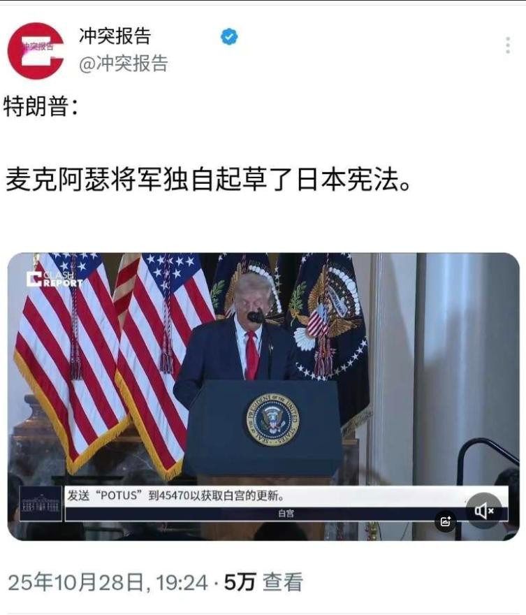 [微风]特朗普昨天(10月28日)在日本表示,当年麦克阿瑟将军独自起草了日本宪法。 他在一番演讲中,轻描淡写地抛出了一个论断:当年日本的宪法,是麦克阿瑟将军一个人搞定的。 这话一出,现场可能有些掌声,但对于了解那段历史的人来说,这简直就像是在说一部宏大的历史大片,其实只有一个演员。这种说法,与历史事实的出入,可不是一星半点。 要理解这事儿有多离谱,我们得把时钟拨回到二战后的东京。那时的日本,是一片废墟,百废待兴。作为占领军的最高统帅,麦克阿瑟确实手握绝对权力,他的目标是为日本打造一部全新的宪法,彻底根除军国主义的土壤。 于是,他下令手下的一群年轻军官和文职专家,也就是所谓的“民政局”团队,在极短的时间内——仅仅一周左右——拿出了一份草案。这份草案后来被称为“麦克阿瑟草案”,它确立了和平主义、尊重基本人权和主权在民等核心原则,尤其是第九条,明确放弃战争,这在当时是石破天惊的。 但是,说麦克阿瑟“独自起草”,就完全抹杀了后续复杂而关键的博弈过程。这份由美国人用英文写成的草案,只是一个框架,一个强加的起点。 它被送到日本政府手中时,日本的内阁成员和法律专家们是震惊和抗拒的。他们之前也准备了自己的方案,也就是所谓的“松本草案”,试图保留更多天皇的权力和旧有的国家体制。然而,在占领军的绝对压力下,日本的方案被直接驳回。日本人别无选择,只能硬着头皮去“消化”这份麦克阿瑟草案。 接下来的过程,才是一部宪法真正诞生的关键。日本的首相币原喜重郎和他的团队,组织了顶尖的法律学者,夜以继日地将这份英文草案翻译成日文,并进行逐条逐句的修订和润色。这个过程充满了无奈和妥协,但也包含了日本精英阶层的智慧。 他们在一些措辞上进行了巧妙的处理,试图在美军强压的框架内,为日本保留一些回旋的余地。比如,关于天皇的地位,草案的表述和最终宪法中的表述就存在细微但重要的差别。 可以说,日本宪法最终的面貌,是美军强权与日本本土法律精英在特殊历史条件下碰撞、妥协的产物,绝非一人之功。 特朗普为什么会这么说?这背后其实是一种非常典型的“美国优先”式历史叙事。他喜欢将复杂的历史简化为强者的恩赐和弱者的接受。在他看来,美国“赐予”了日本和平与民主,麦克阿瑟就是那个带来礼物的英雄。 这种叙事方式,一方面满足了国内部分民众的优越感,另一方面也是在向盟友和对手强调美国的绝对主导地位。他不是在上一堂历史课,而是在进行一场政治表演,核心是彰显“美国伟大”。 然而,这种表演的代价,是扭曲了历史,也可能无意中伤害了盟友的感情。对于日本人来说,这部宪法是他们战后重建的基石,尽管是在屈辱的压力下诞生,但日本人民和政府为适应、解释和运行这部宪法付出了巨大的努力。 特朗普的“独自起草论”,无形中抹杀了日本在战后重建中的主体性和挣扎,将日本描绘成了一个完全被动的、没有思想的接受者。这种居高临下的姿态,在一些自尊心强的日本人听来,可能并不是赞美,而是一种冒犯。 更深层次看,这种对历史的随意解读,反映了一种危险的倾向:将历史工具化,服务于当下的政治目的。当历史不再是客观存在的事实,而是可以随意揉捏的泥团时,国与国之间的互信基础就会变得非常脆弱。 今天可以说麦克阿瑟“独自起草”了日本宪法,明天是不是就可以说美国“独自缔造”了欧洲的和平?这种逻辑的延伸,会让国际关系变得像一场谁嗓门大谁就有理的争吵。 所以,特朗普的这番话,看似只是一个历史知识的小错误,实则暴露了一种深刻的历史观和政治哲学。它将一段充满痛苦、妥协与重生的复杂历史,简化成了一出个人英雄主义的独角戏。这既是对历史的不尊重,也是对那些在废墟上努力重建国家的人们的努力的漠视。 那么,这就引出了一个值得我们思考的问题:在国际交往中,一个国家应该如何讲述自己和他国的历史?是应该选择那种能够鼓舞士气、彰显功绩的“简化版”,还是应该直面其中的复杂、矛盾甚至是不堪,去寻求一种更深层次的理解和共鸣呢?你的答案是什么?
