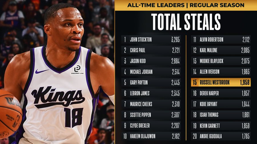 威少本场送出1抢断,生涯总抢断来到1958次,超越德里克-哈珀,升至历史抢断榜第15位。