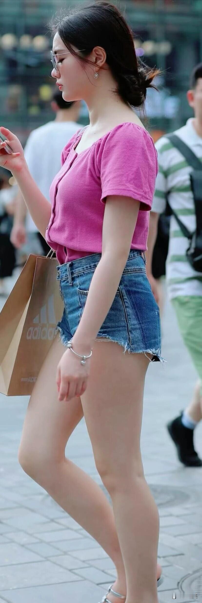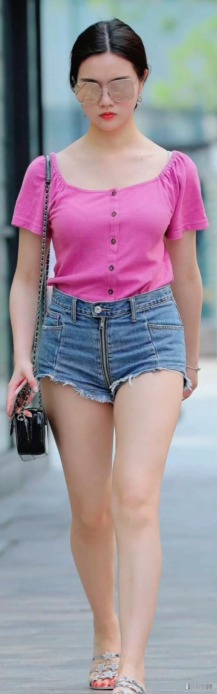 街头的夏日亮色!玫粉色方领上衣搭毛边牛仔热裤,脚踩星星凉鞋,手提小黑包,活力又吸