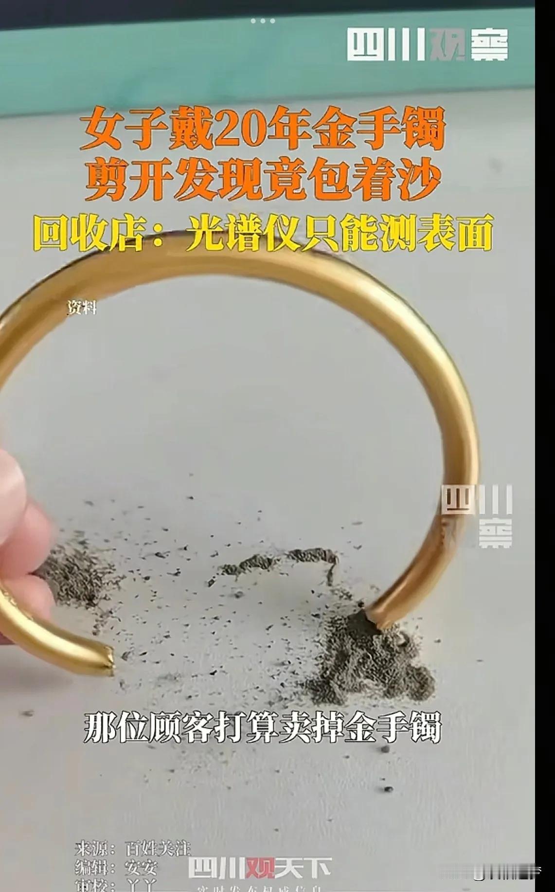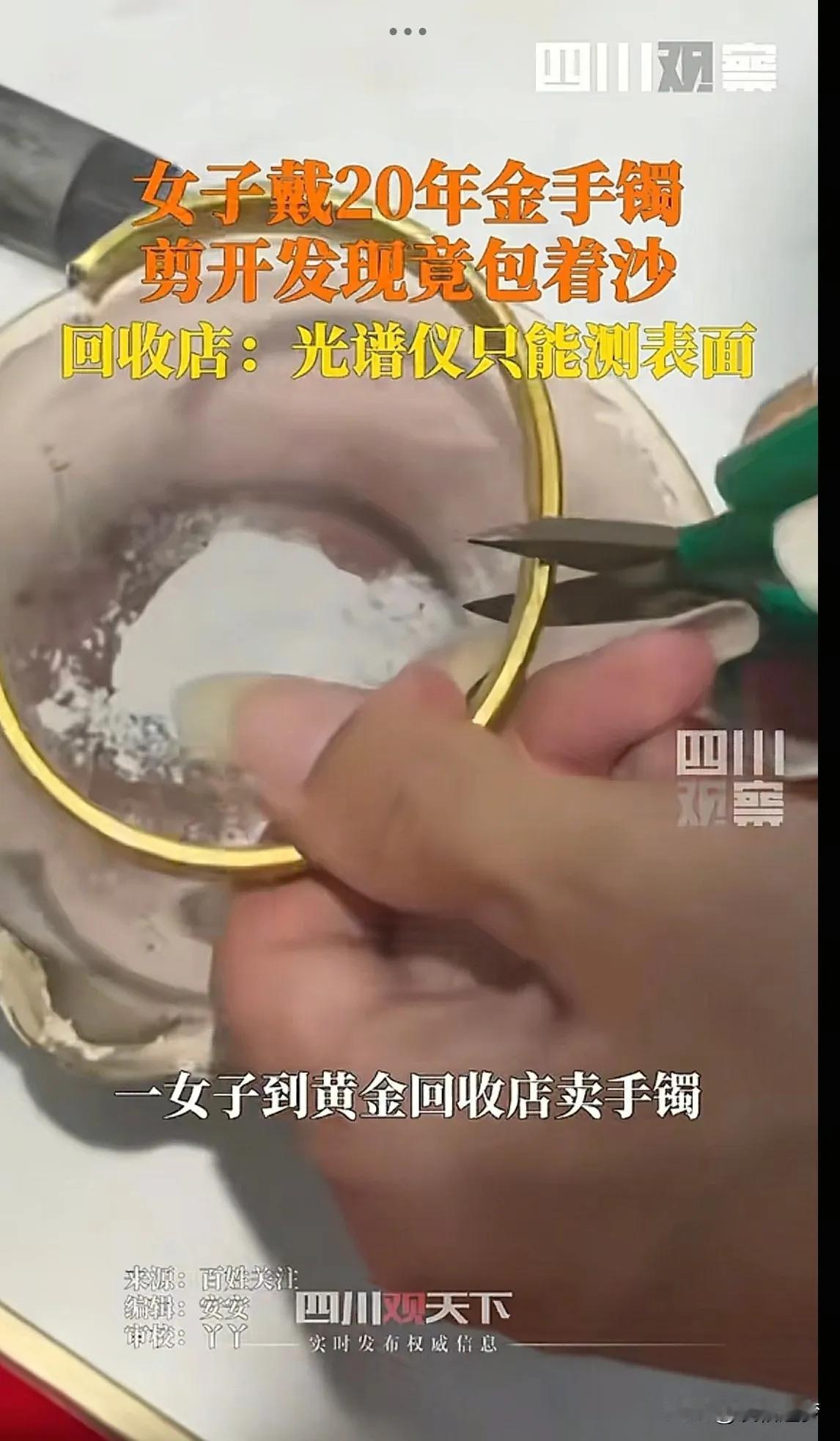 江西景德镇一女子见金价上涨,将戴了20年的手镯送金店回收。老板剪开后发现,空心手镯内填满沙子,称重达七八克,按现价算损失近万元。 女子找当年打金的小店质问,因无收据和录像,店家拒不承认,她只能认栽。此事提醒,光谱仪仅能测金饰表面,打金需去正规店、全程紧盯并索要凭证。 网友评论: 用沙子填应该一填不实呀,摇一摇肯定听到里面声音。 利欲熏心。所以不敢买黄金,只要你买就有上不完的当。 没有诚信,都不讲诚信,一切向钱看,毁掉的是整个社会的信仰。 [捂脸]你以为正规的就不坑人吗?古人曰:无奸不商还是有一定道理的。 报警呀,既然在她面前作假,肯定在别人面前也做过假。