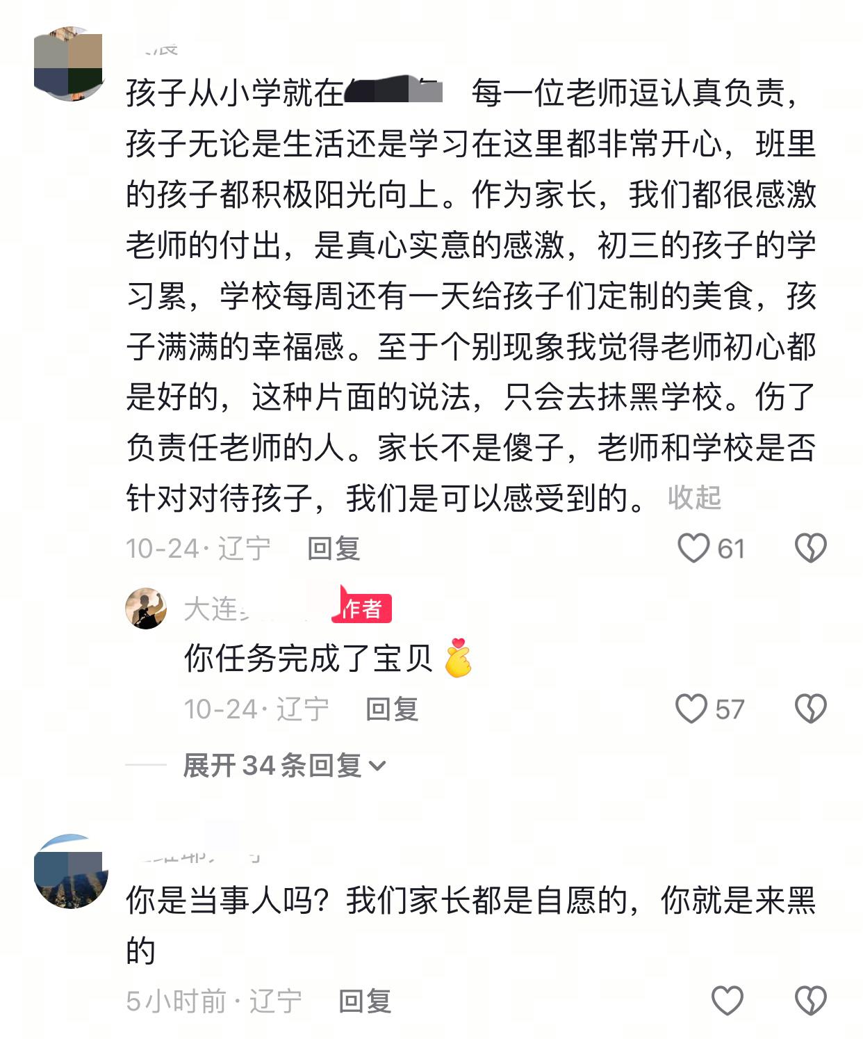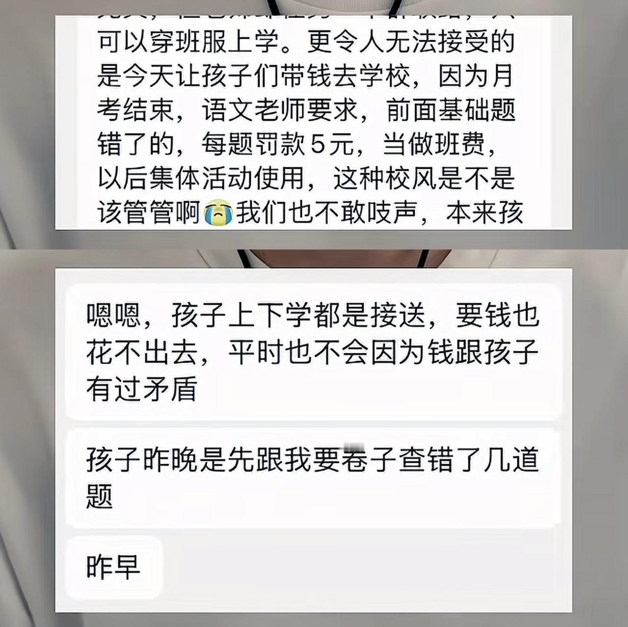 看到大连这位博主的评论区,才明白家校矛盾的关键不在老师而在踊跃表现的家长…… 他把大连某学校错1道(基础)题罚5元现金的事情替家长说了出来(不满的家长主动提供线索),而且当地已经确认属实,让人没想到很多留言都是说他多管闲事,还以某学校学生家长的身份夸学校支持老师,还在后台投诉这位博主。老师的初衷可能是好的,但对学习吃力的孩子来说这样的罚款确实有压力。