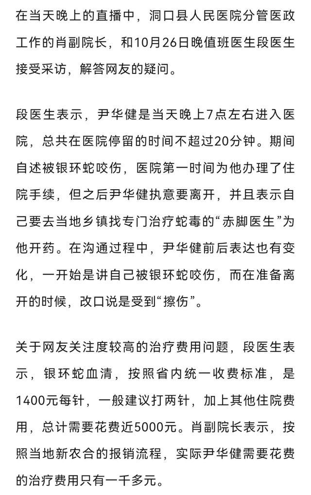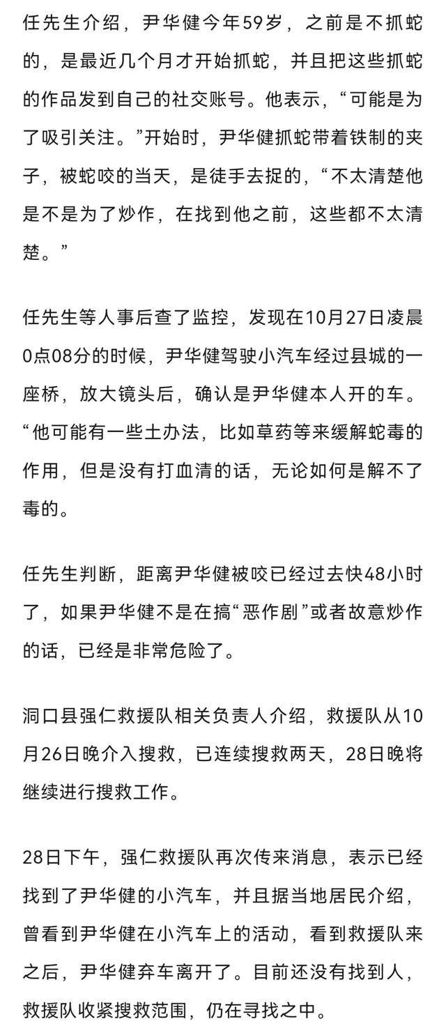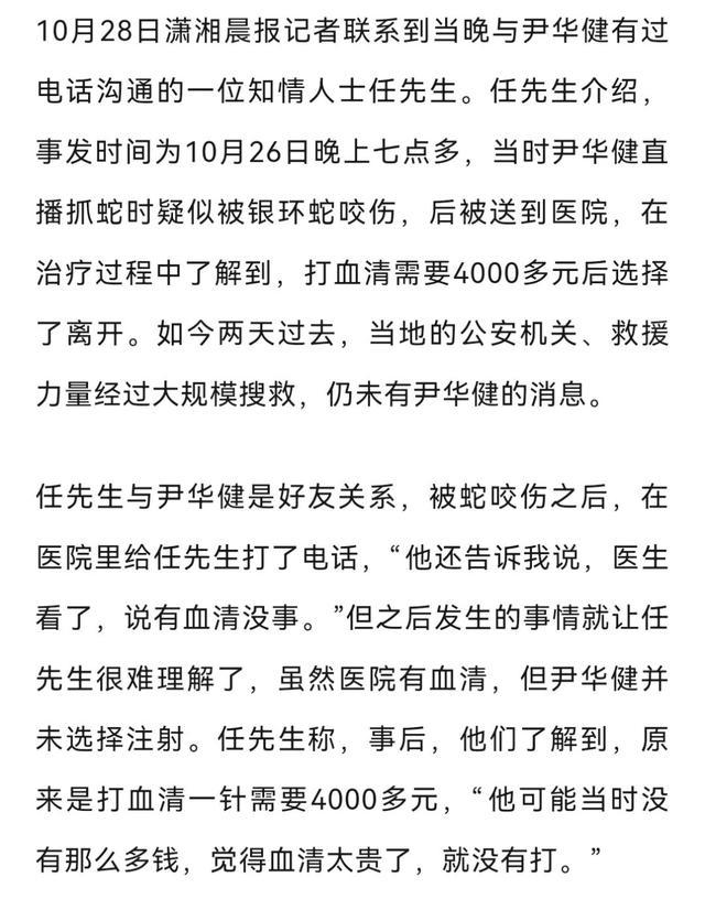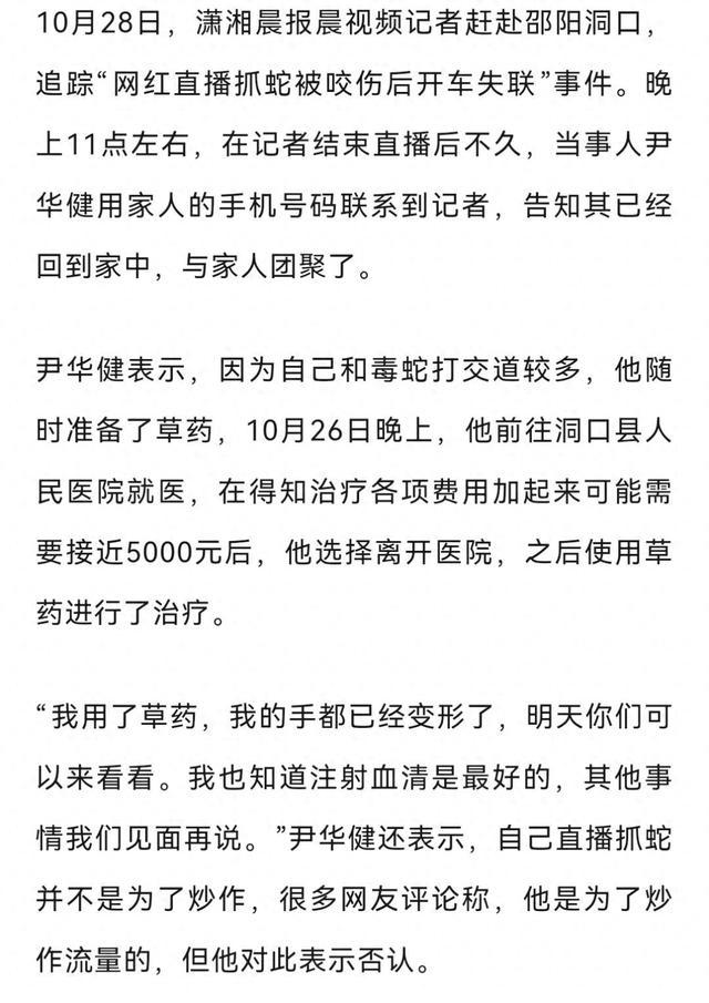 10月27日,有网友发视频称,湖南邵阳洞口县有一名男子尹华健在直播挖蛇时被蛇咬伤,他到医院检查后却自行离开,至今下落不明。