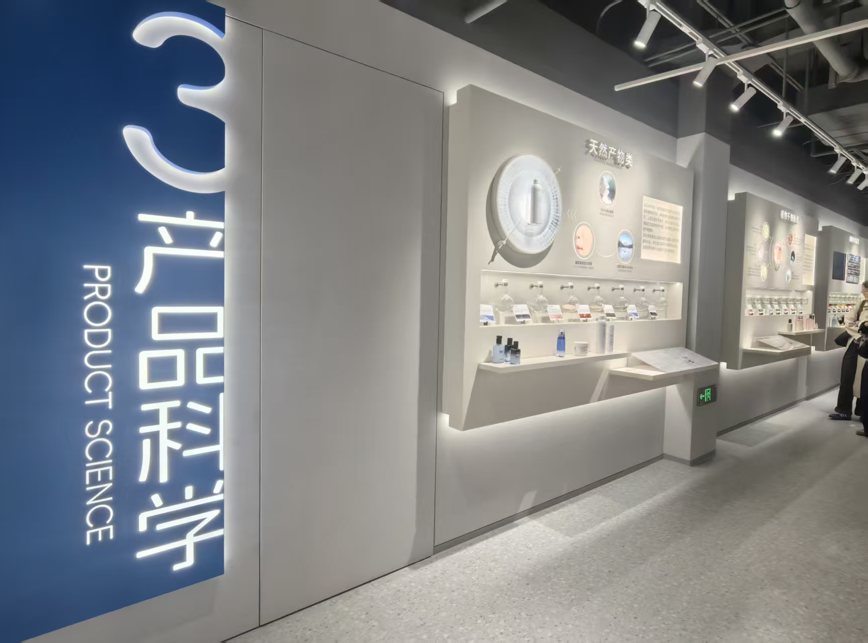 该美妆城集智能制造、工业旅游、科普体验于一体。在化妆品科学与艺术展厅内,自然堂集团通过“数说皮肤”“航天护肤科技”以及互动装置等趣味科普形式,介绍化妆品背后的基础科学。
