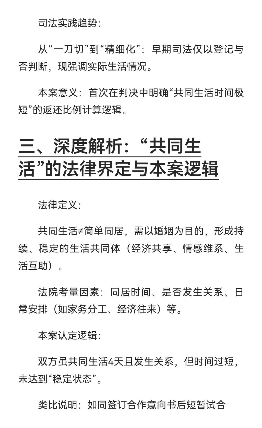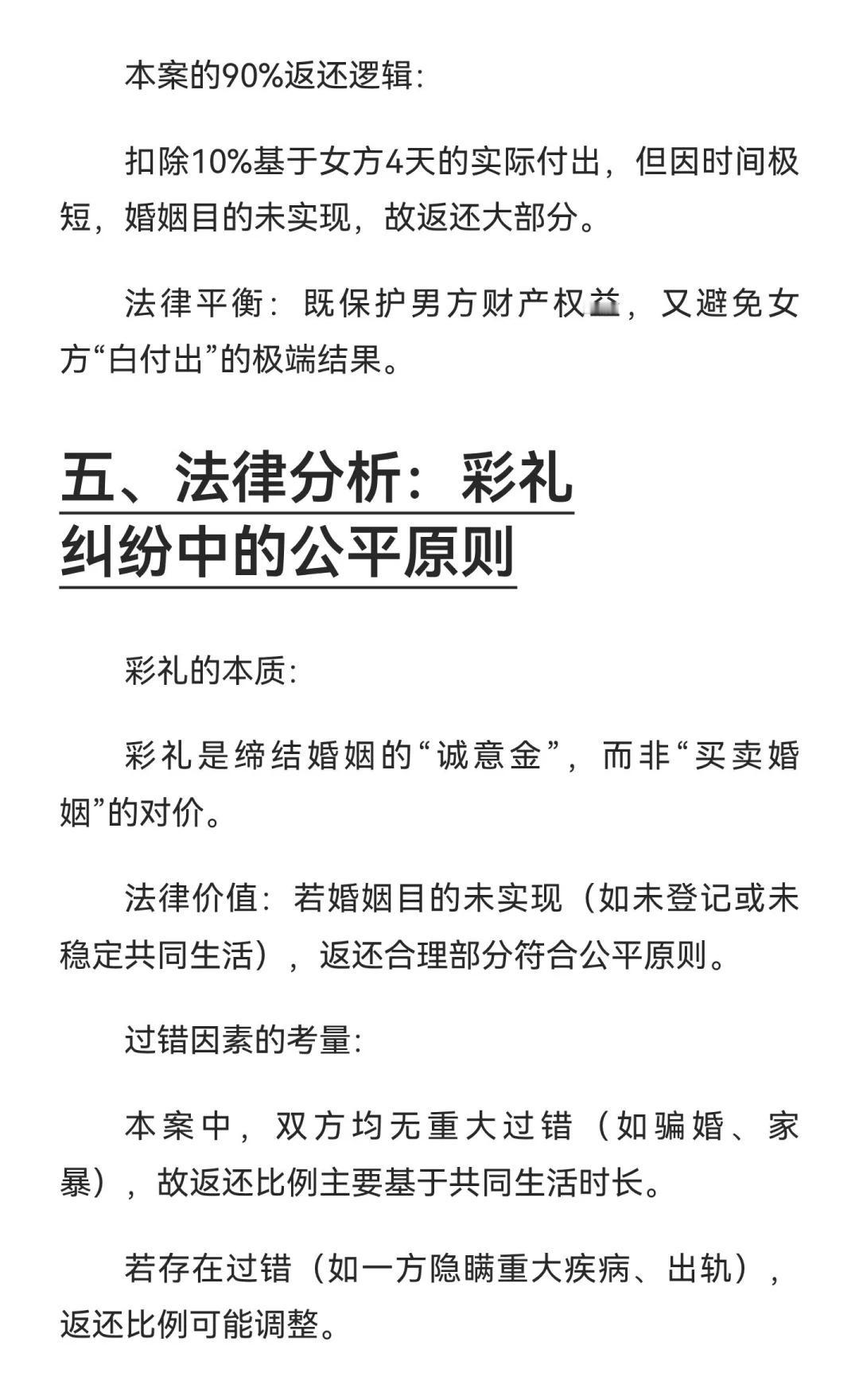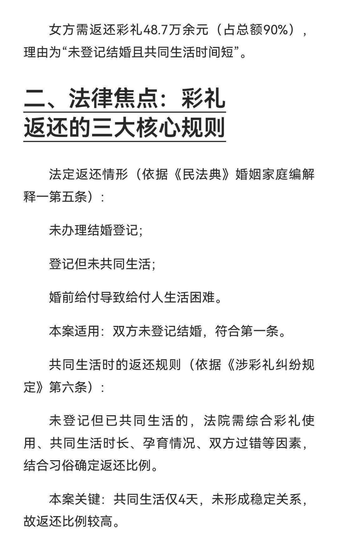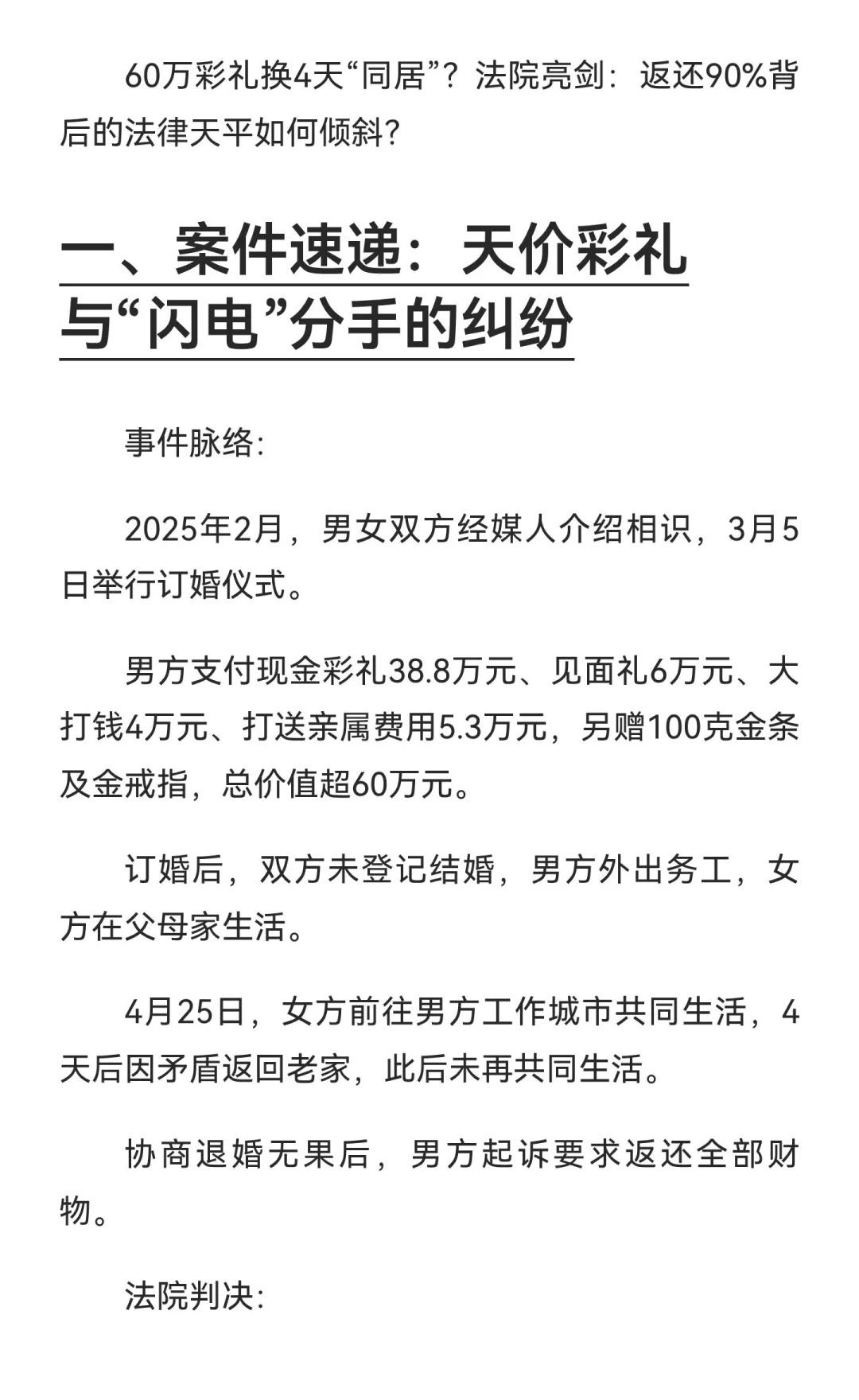 60万彩礼换4天“同居”?法院亮剑:返还90% 法院判决女方返还男方90%彩礼,因双方未登记结婚且共同生活时间短。判决结合彩礼金额、共同生活时长及习俗,体现法律对公平的坚守,避免“情财两空”。 法律服务 律师咨询 律师 北京律师 法律咨询 彩礼 同居财产分割 彩礼退回 彩礼返还