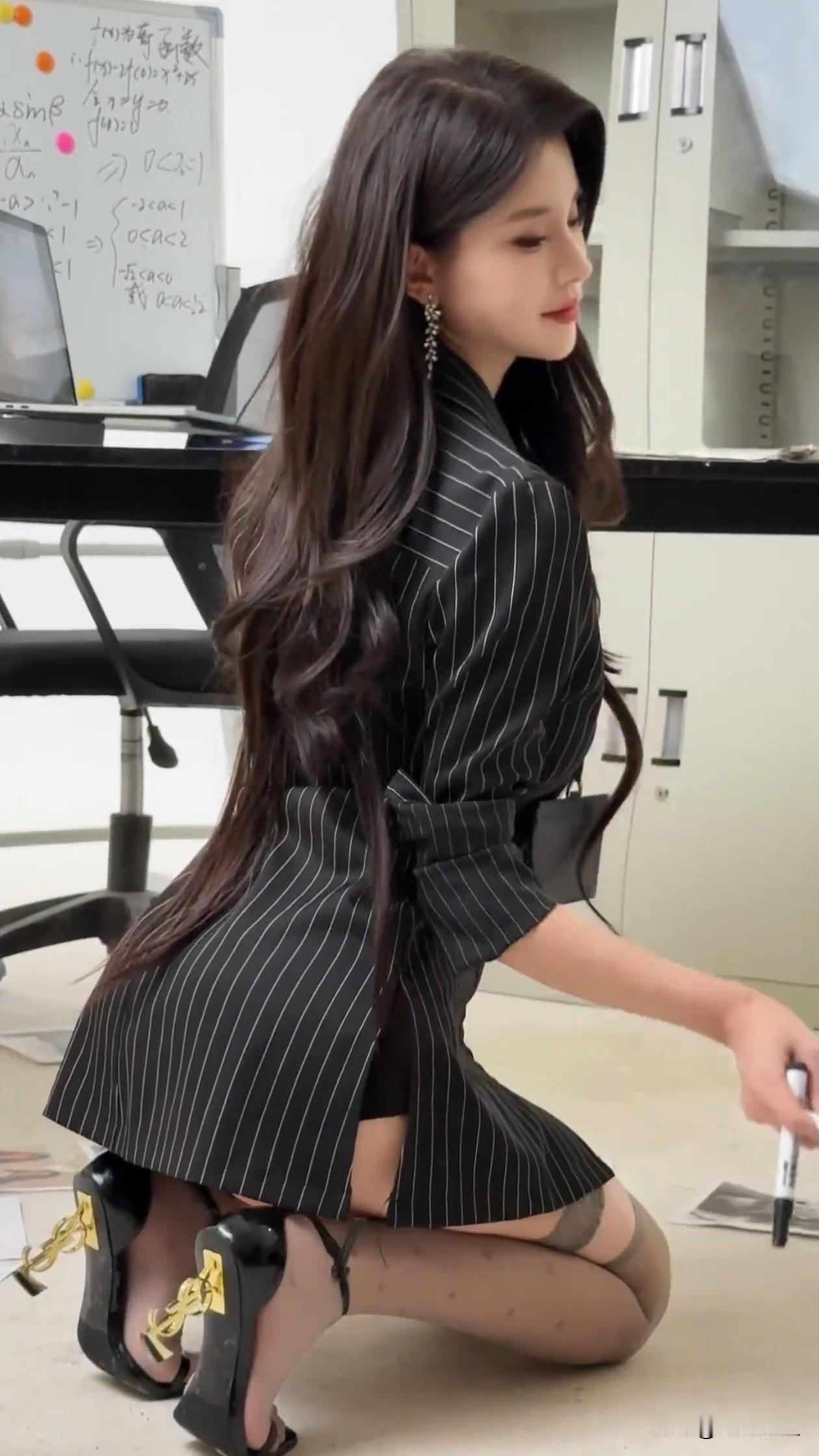 职场风尚,从不止于“专业”二字。修身条纹西装裙利落勾勒身形,深V藏不住的自信,配丝滑过膝袜与精致耳饰,让干练里漾开柔媚。白板公式是智慧注脚,转身时裙角轻扬,她把职场的规则穿成风姿,让每个眼神都写满:美与能力,本就该共生绽放。