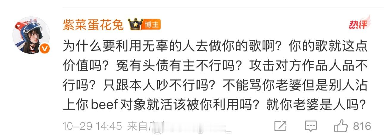 “为什么你老婆怀孕就是最大的,别人不是人吗?不能骂你老婆,但别人沾上beef对象,就活该被你利用吗?”
