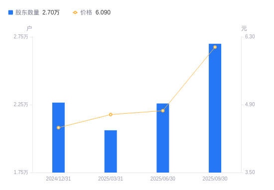 日期A股户数(户)流通A股户均持股数(股)户均持股市值(万元)2025-09-302699117109.9210.422025-06-302259120441.169.762025-03-312061522400.5010.522024-12-31226596620.062.932024-09-30238396292.312.992024-06-30242606183.112.282024-03-31259315784.622.822023-12-31273835477.643.362023-09-30294175098.893.272023-06-30307124883.883.10