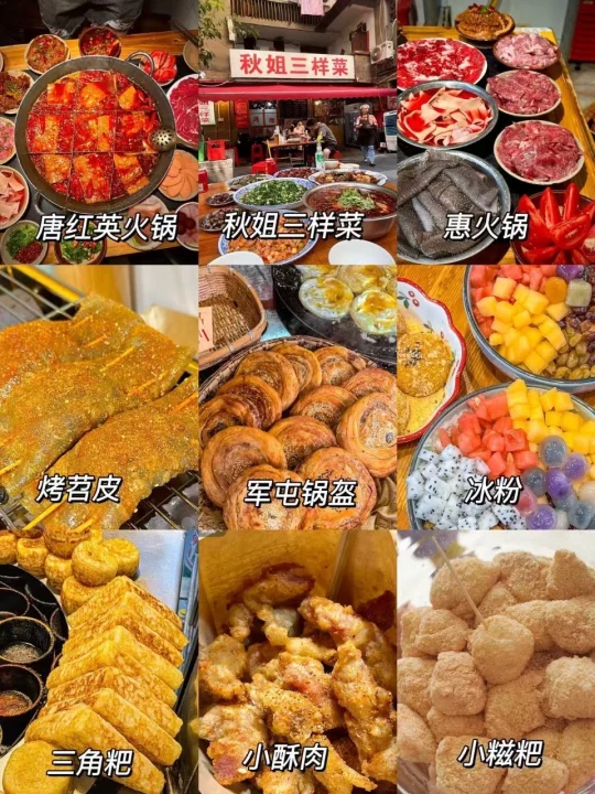 ✅重庆小吃:烤豆干、烤苕皮、油茶、滑肉、糯米团、凉糕、抄手、狼牙土豆、红豆汤、山城小汤圆、烤冷面等;