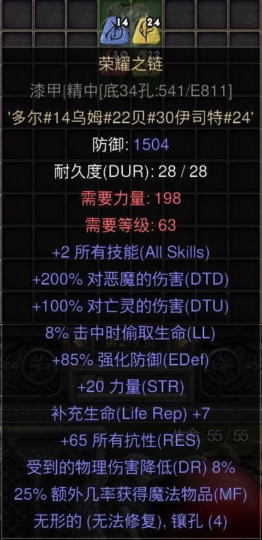 暗黑二重制版国服战网拍卖极品之荣耀之链 符文之语荣耀之链。 荣耀之链是一个比较古老的符文之语,在暗黑破坏神二的老版本就上线了,但却不受欢迎。究其原因是因为以前佣兵必选刚毅,输出无敌,而且刚毅造价也便宜。而现在角色的增强,尤其是治愈头的广泛使用,头戴治愈手拿无限,正好缺少吸血来续航,这时候荣耀之链被纳入了视野,其二技能也能提升光环效果,现在已经成为米山标准衣服。 这件荣耀之链选择15ed无形漆甲作为底材,正是现在的最佳选择,漆甲力量需求正好适合米山,而无形神圣盔甲力量需求太高,头戴治愈的米山力量已经带不起了。 底价200,以300成交。 暗黑破坏神2重制版 暗黑2重制版