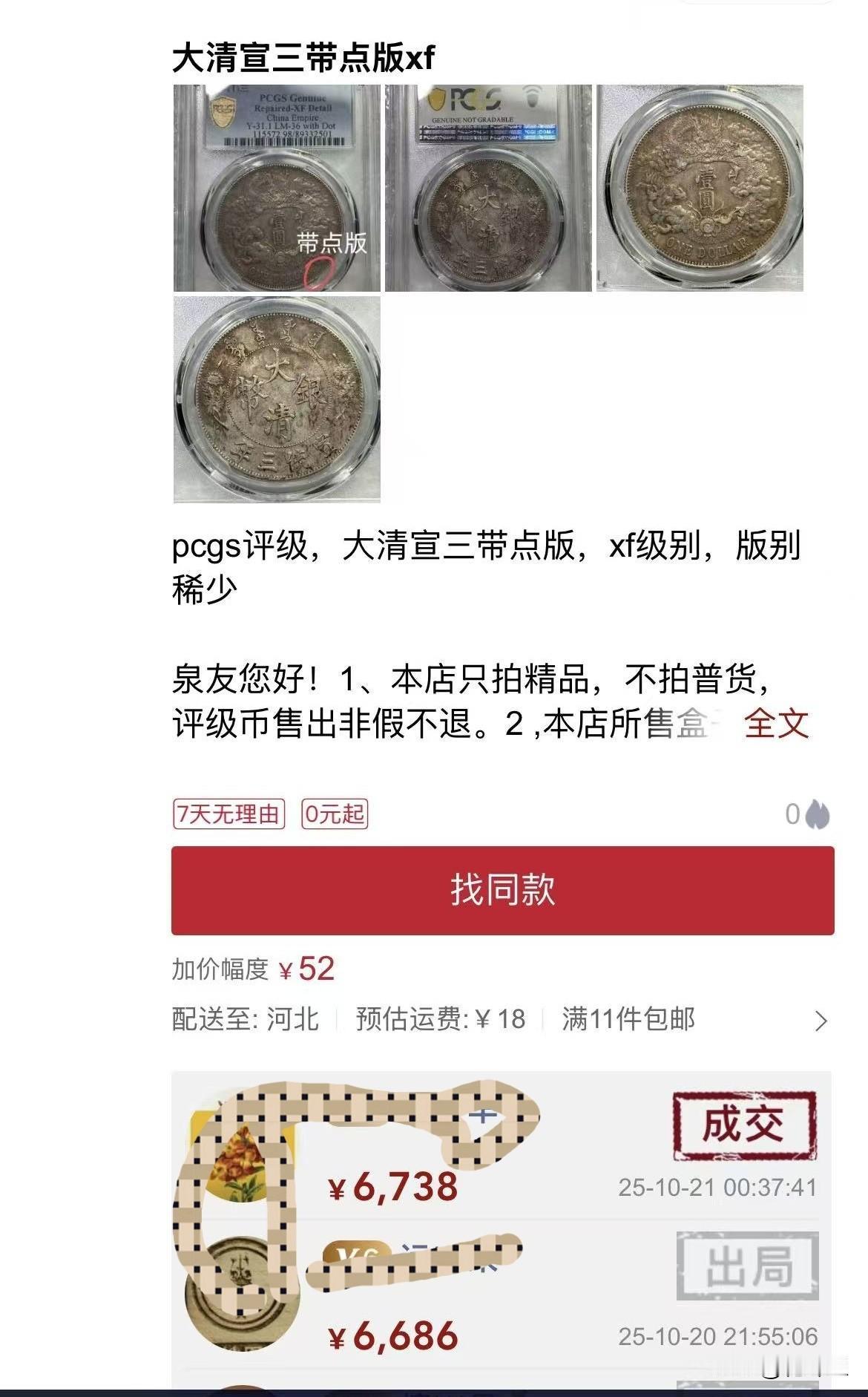 看看现在银元什么价格了? 近期在某拍堂成交的大清银币宣三,pcgs评级为98,经过多次竞拍,以6738元的价格截拍。 这枚大清宣三还是枚版别币,带点版,就是英文字母R后面有个圆点,比普通的大清宣三少。 银元版别价值 光绪大清银币 古银元鉴赏 银币行情
