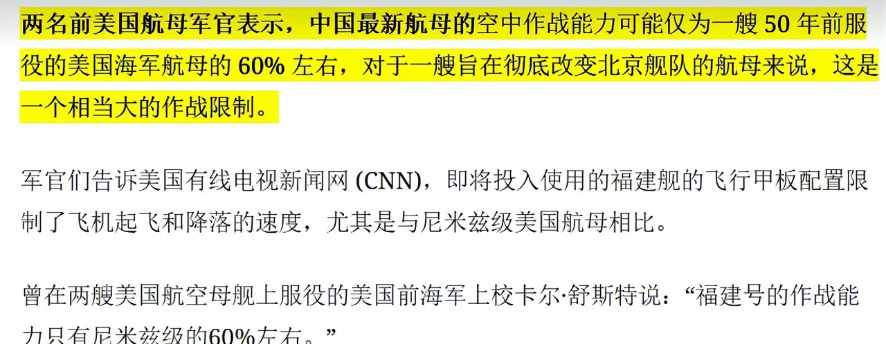 🔻CNN上周报道:中国即将服役的福建号航母某些关键方面不如五十年前的美军尼米兹号航母。