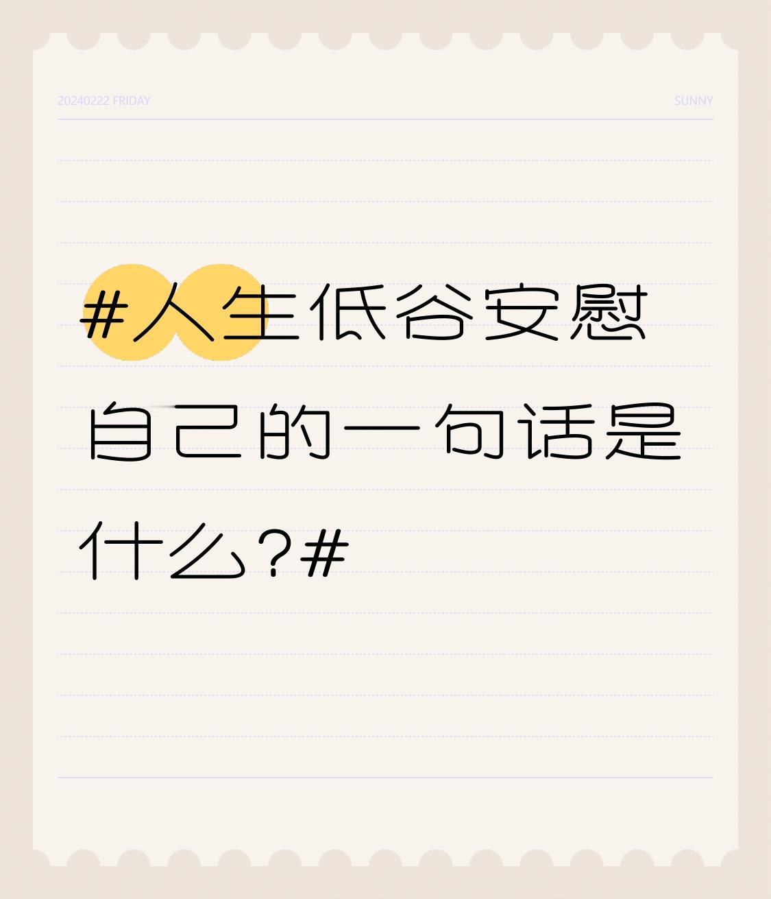 人生低谷安慰自己的一句话是什么? 人生跌入低谷时,我常对自己说:“是雾都会散,是遗憾也会慢慢释然。”就像生活中那些笼罩着的迷茫与痛苦,不过是暂时的迷雾。 过去的失败与不如意,如同昨天的太阳,再热也晒不干今天的衣服。没必要一直沉溺在过去的阴影里,过去的再看也没有意义,往前看,才会有惊喜。 心态好,一切都会好。先过好今天,时来运转都是必然。与其在低谷中怨天尤人,不如保持好心态,等待迷雾消散,迎接新的曙光。
