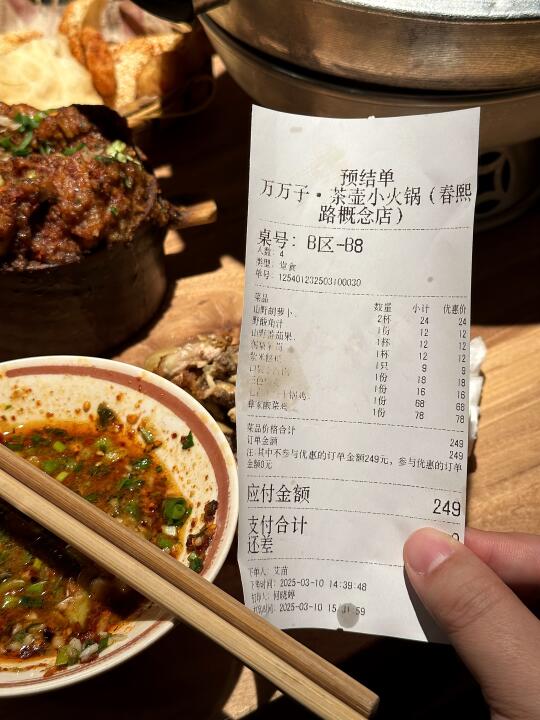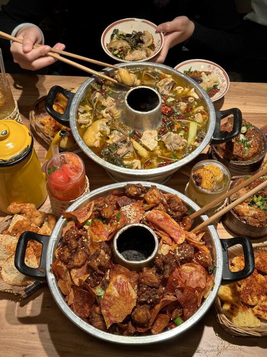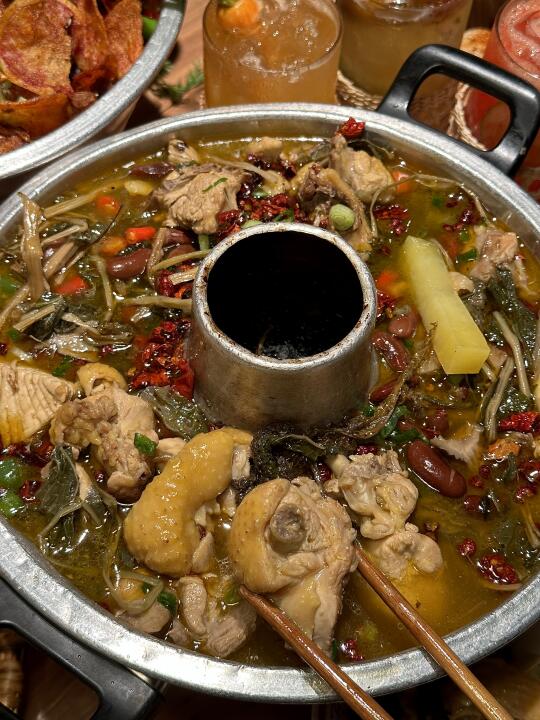 真的太废饭了!!!跟朋友四个人点了两个锅(薯片鸡+彝家土豆鸡)+一些小吃刚合适!土豆还是云南那种七彩土豆,吃下来人均60左右,没有一样踩雷的,下次再来!!