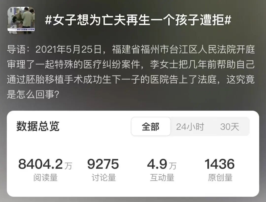 2021年5月25日,福建省福州市台江区人民法院开庭审理了一起特殊的医疗纠纷案件,李女士把几年前帮助自己通过胚胎移植手术成功生下一子的医院告上了法庭。