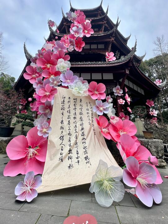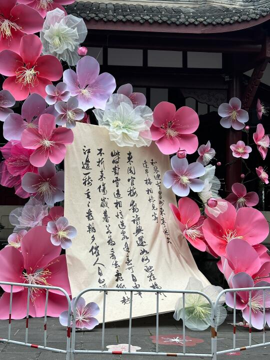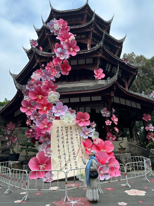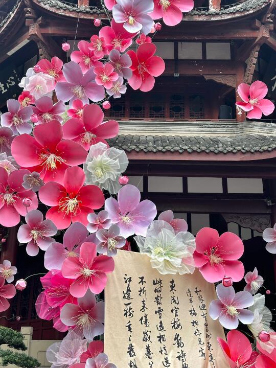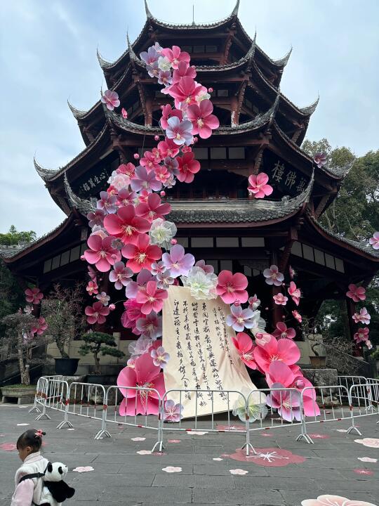 在成都闲逛的时候发现一处梅花瀑布! 当花海瀑布遇上中式建筑,不得不说国风才是真正的浪漫!!!太太太震撼了🫨 📍杜甫草堂东大门(万佛楼)