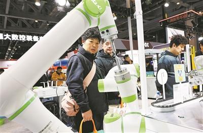 2025上海国际机床展上,参观者在一个进行作业演示的双臂协同机器人前驻足观看。新华社记者方喆摄