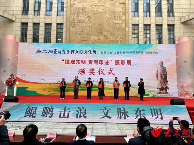 颁奖仪式上,庄子文化创意大奖赛、“镜观东明黄河印迹”摄影展、“翰海逸风逐梦兰亭”书法篆刻作品展、“自然的诗行”押花艺术作品展、以及“黄河之韵庄子哲思”主题原创歌曲大奖赛的获奖者依次上台领奖。