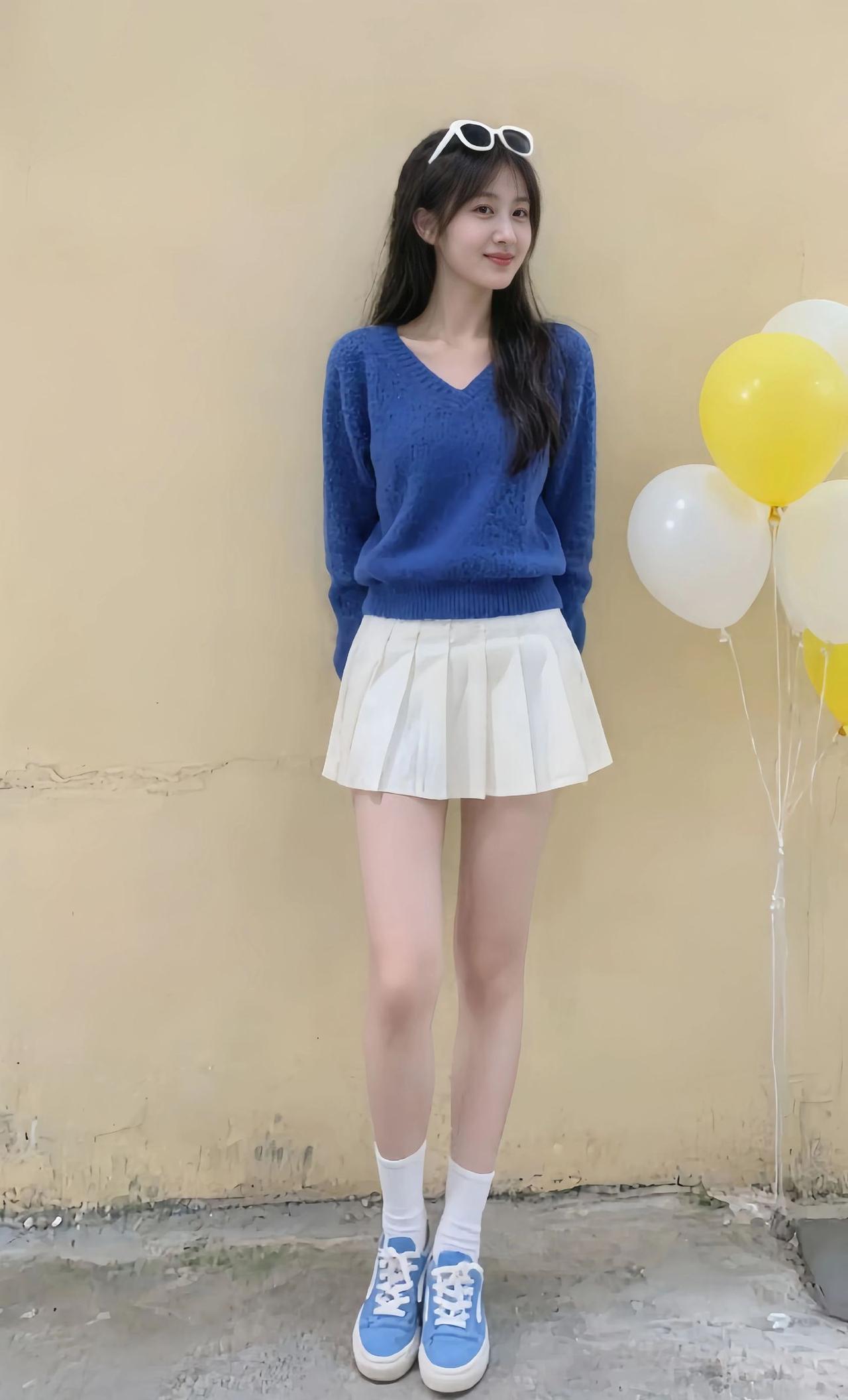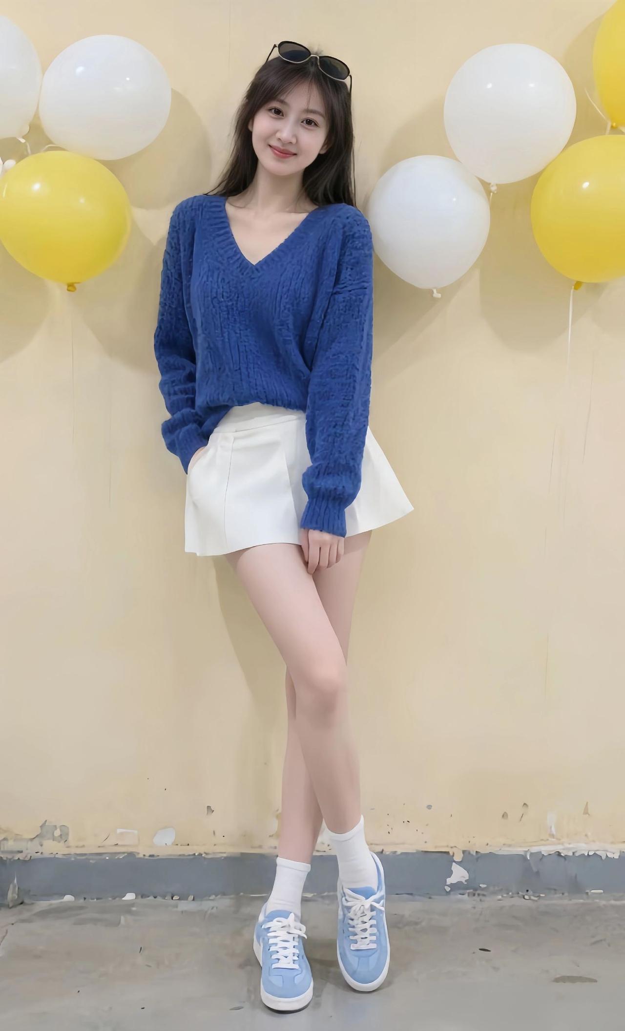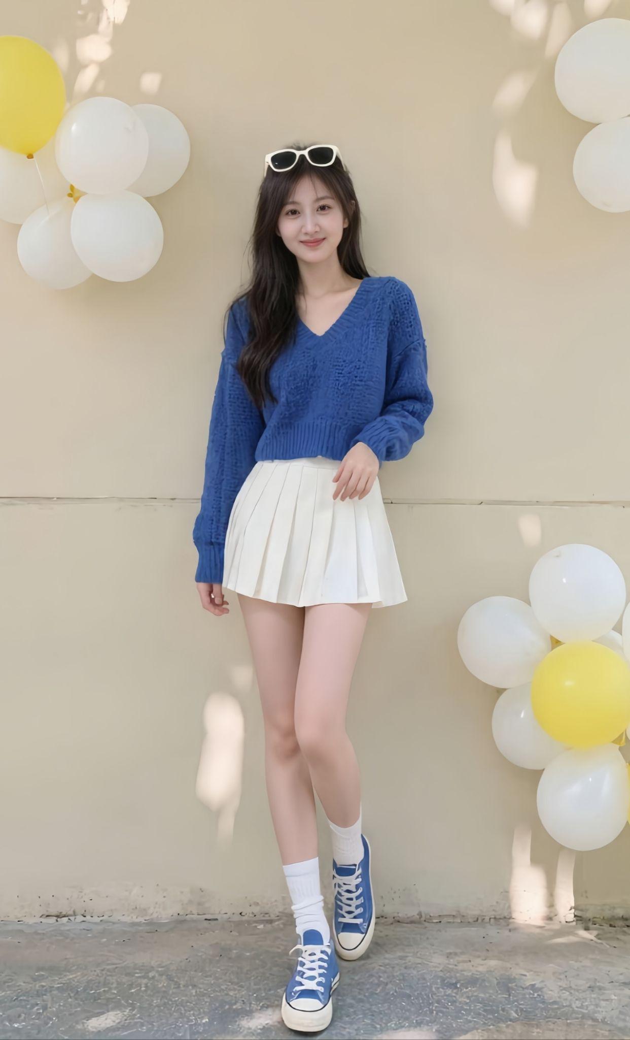 少女心满满的一天,蓝色毛衣配白色短裙,阳光明媚,气球相伴。🌞🎈💙💚