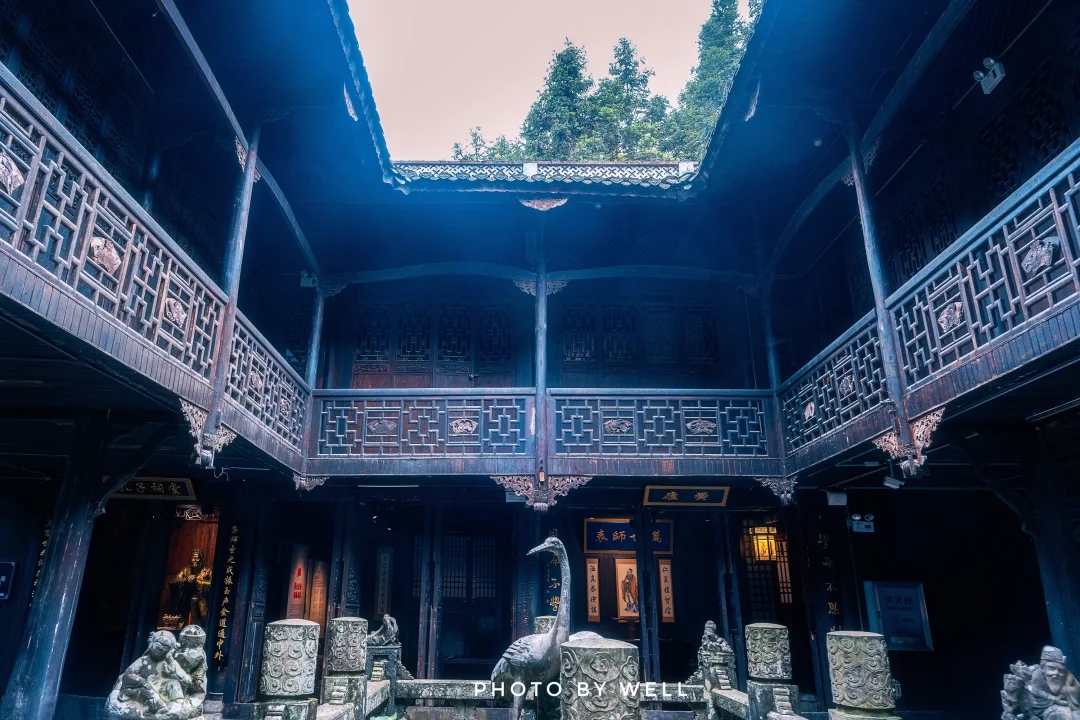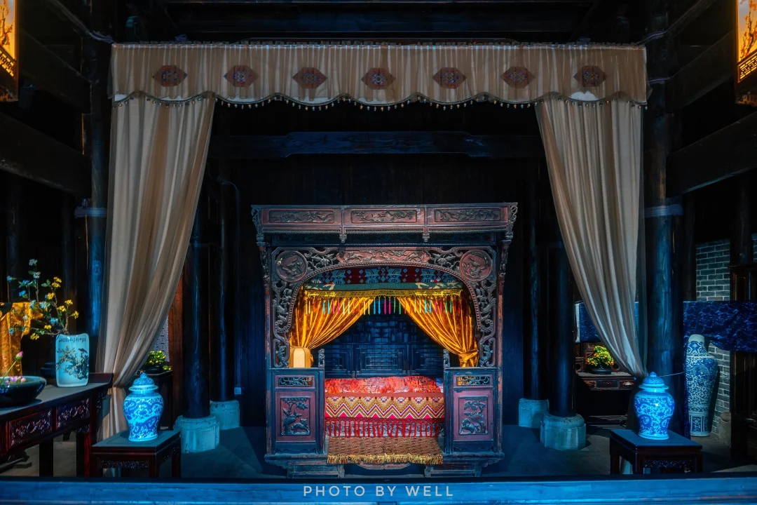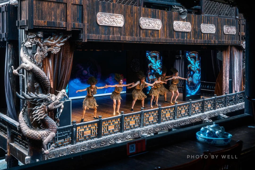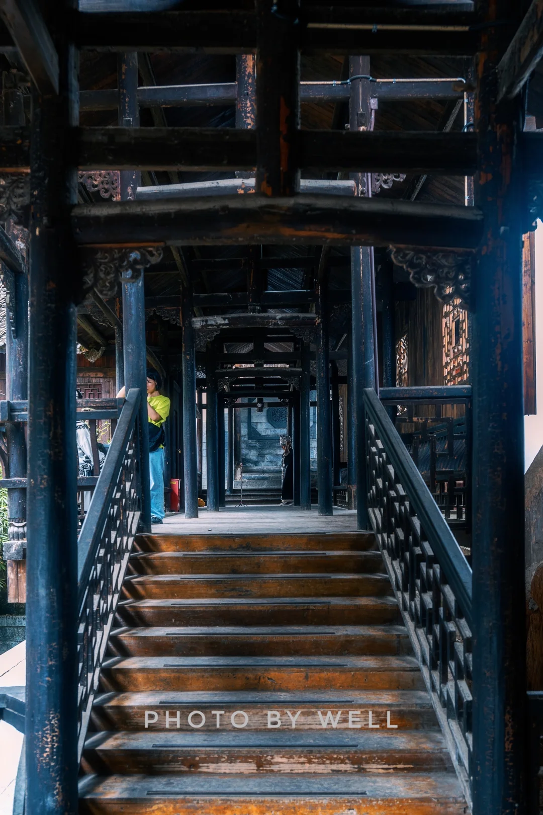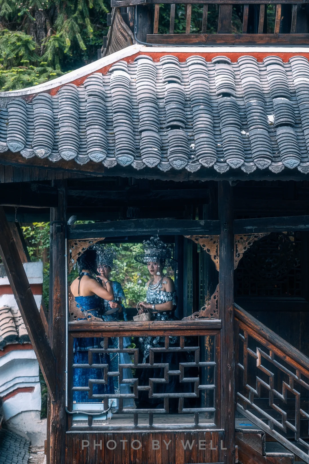 九进堂的建筑最为神奇之处在于,木楼的檩、椽、梁、柱之间甚至看不到一根铆钉,好像全部由榫卯、楔子等衔接而成。建筑师利用檩、柱、格等,把一个中庭的穹顶造出别具一格的天棚。登上最高楼远眺,层层叠叠的屋顶,五花八门的屋角装饰,让人目不暇接。很多租民族服装的游客在建筑内打卡拍照。