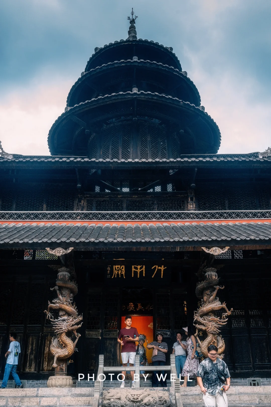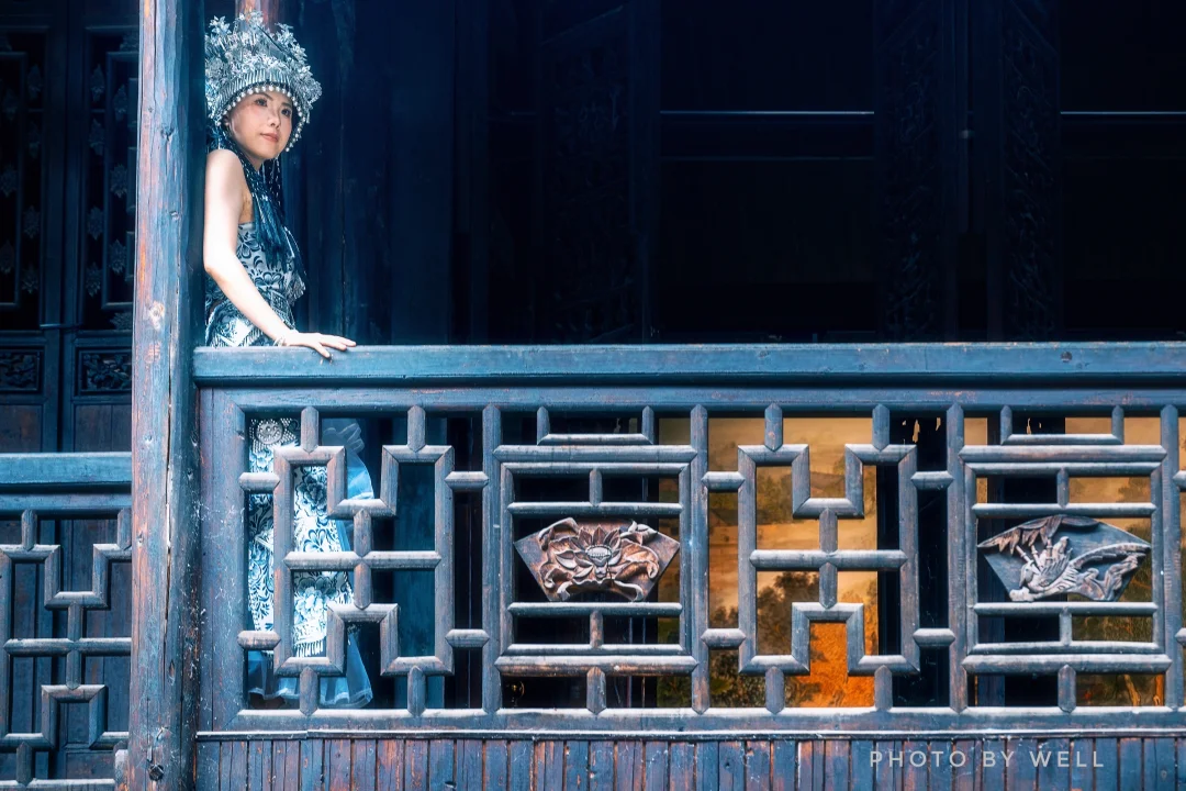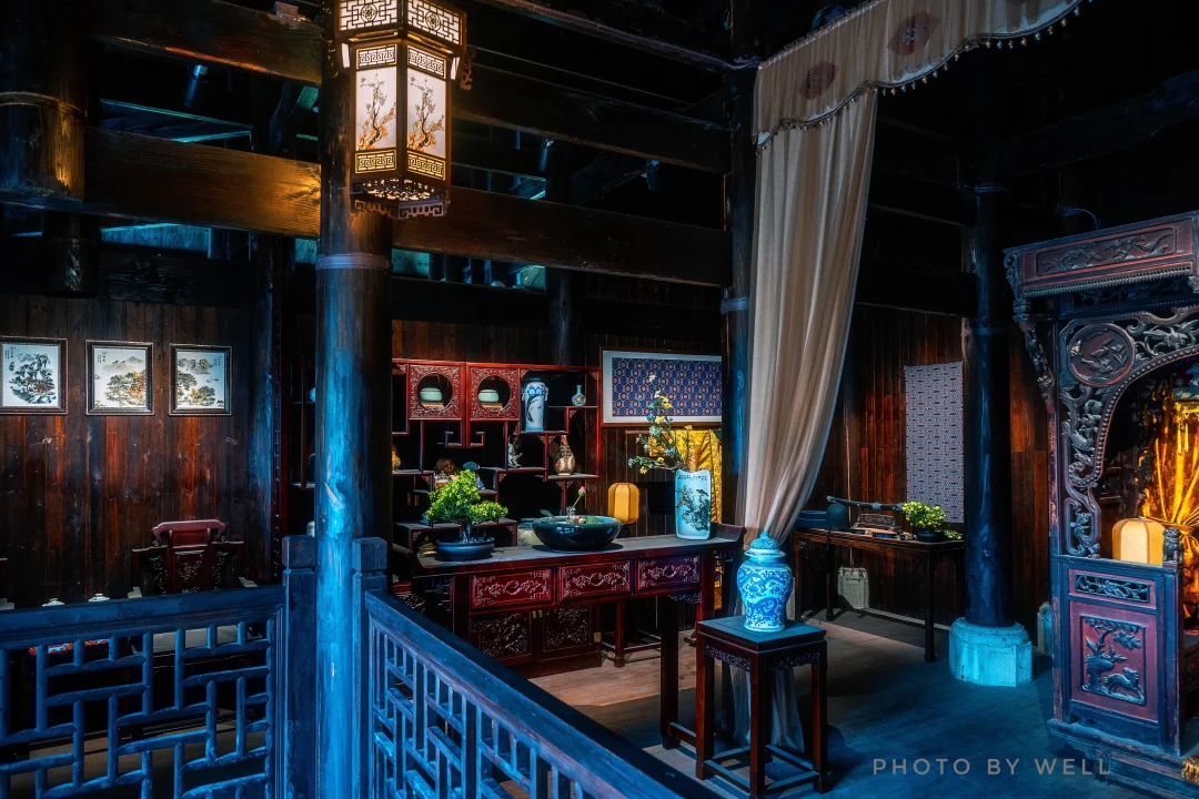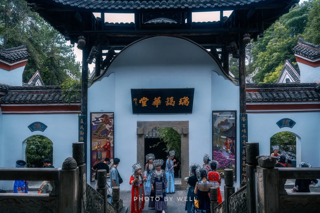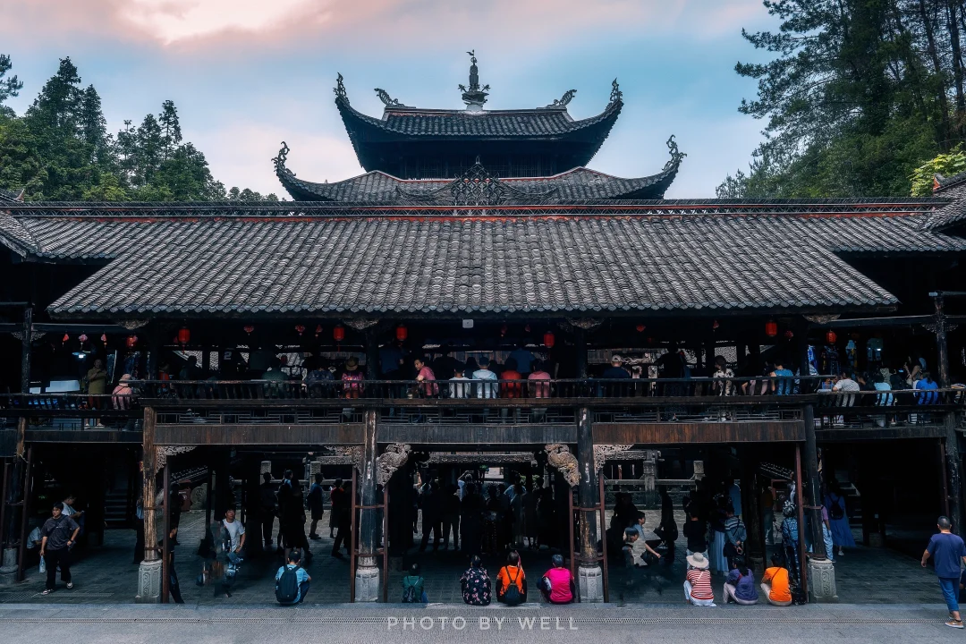 九进堂的建筑最为神奇之处在于,木楼的檩、椽、梁、柱之间甚至看不到一根铆钉,好像全部由榫卯、楔子等衔接而成。建筑师利用檩、柱、格等,把一个中庭的穹顶造出别具一格的天棚。登上最高楼远眺,层层叠叠的屋顶,五花八门的屋角装饰,让人目不暇接。很多租民族服装的游客在建筑内打卡拍照。