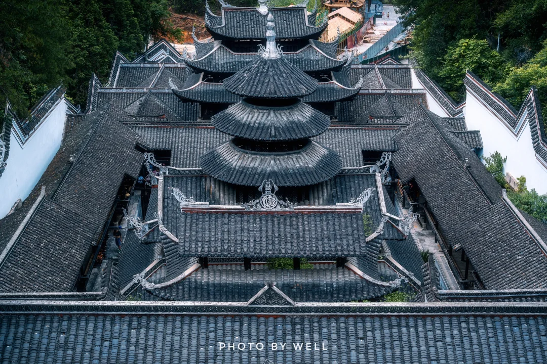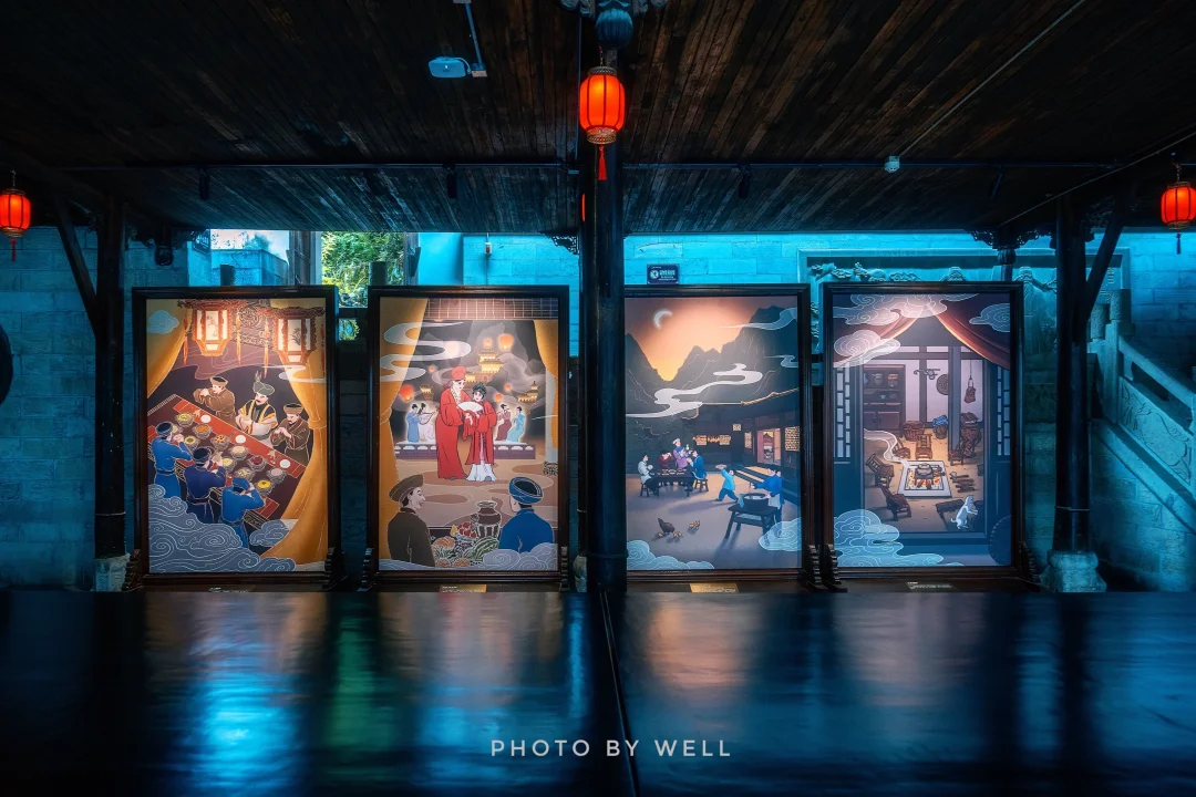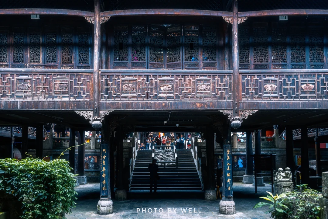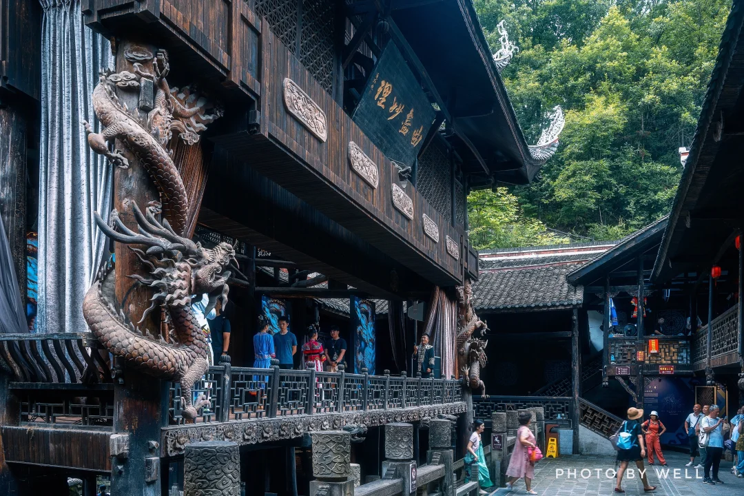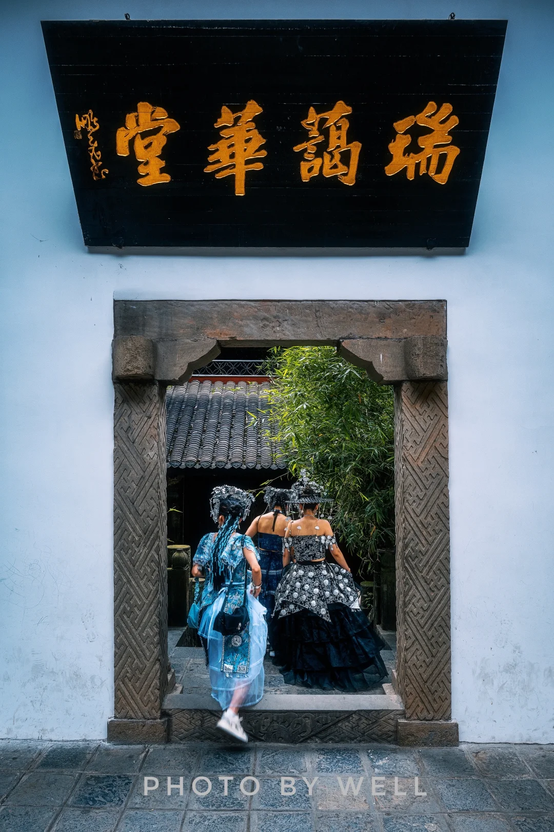 九进堂的建筑最为神奇之处在于,木楼的檩、椽、梁、柱之间甚至看不到一根铆钉,好像全部由榫卯、楔子等衔接而成。建筑师利用檩、柱、格等,把一个中庭的穹顶造出别具一格的天棚。登上最高楼远眺,层层叠叠的屋顶,五花八门的屋角装饰,让人目不暇接。很多租民族服装的游客在建筑内打卡拍照。