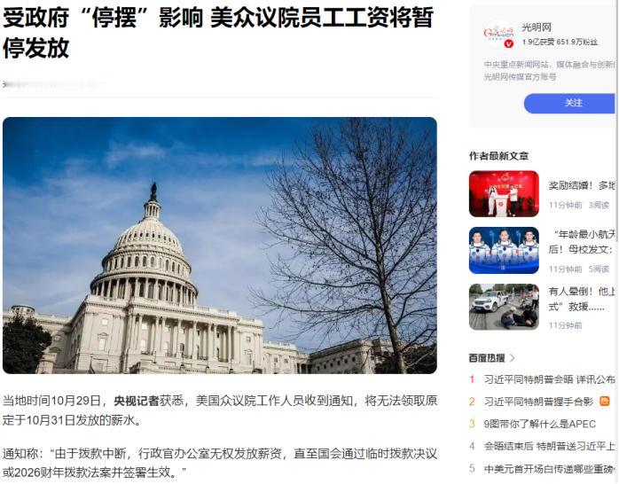 10月30日,美国众议院的工作人员收到通知,原定于10月31日发放的薪水将无法领取,原因正是持续的政府“停摆”导致拨款中断。这下连制定政策的国会自己也发不出工资了,真是让人哭笑不得。 但别看这场景听着荒唐,其实早有预兆,说到底还是联邦政府运作时留下的老毛病,是预算制度和两党互相扯皮凑出来的结果。 美国联邦政府有个规矩,每年10月1日就进入新的财政年度。政府各个部门要想正常干活,钱得国会提前批——要么通过正式的预算法案,要么先给个临时拨款。 可一旦两党在预算上谈不拢,闹僵了,联邦政府就会因为“没钱”停摆。到时候非核心部门得关门,相关人员的工资自然也发不出来。 众议院工作人员的工资,刚好就在年度拨款的覆盖范围里;但议员们不一样,他们有宪法“撑腰”。 宪法里明明白白写着,议员的工资由美财政部用“永久性强制拨款”支付,就算政府停摆,议员照样能按时拿到至少17.4万美元的年薪,议长更厉害,能拿22.35万美元。 你看这制度多偏心,制定规则的人反倒能躲开规则的约束,真正干活的工作人员,倒成了两党吵架的“牺牲品”。 这种事儿在美国可不是头一回发生,近半个世纪里,联邦政府停摆已经超过20次了。 最让人印象深的是2018年12月到2019年1月那回,当时特朗普政府和民主党为了美墨边境墙的拨款吵得不可开交,结果政府一停停了35天,创了历史最长纪录! 那回四分之一的联邦机构都停了,80万员工直接受影响——其中42万人被逼着没工资还得上班,38万人只能无薪休假,众议院的辅助工作人员就在里面。 那段时间,华盛顿特区阿灵顿市的餐馆都看不下去了,专门推出了“政府关门三明治”,用打折餐食安抚那些被迫休假的公务员,这份特殊的“菜单”,也成了政治僵局下的无奈小插曲。 不过这次停摆,比以前更让人闹心。复旦大学的沈逸教授算过一笔账:政府停摆的时候,关键岗位的员工没工资还得干活,非关键岗位的只能休假,就单说这些人每天损失的工资,加起来就有差不多4亿美元。 更麻烦的是,2019年通过的《政府雇员公平待遇法案》,本来早就说好了,停摆期间被迫休假或者无薪工作的联邦雇员,等政府恢复运作后能补发工资。 可最近白宫发的法律备忘录却变了说法,说这法案并不自动覆盖所有休假的人,甚至还放话,要是停摆一直持续,可能会大规模裁员。 这就意味着,众议院的工作人员不光短期拿不到工资,连以后补钱的希望都可能没了,本来稳定的“铁饭碗”,这下变得悬乎乎的。 停摆对工作人员的影响,早就不只是工资那点事儿了,连日常生活都搅得一团糟。2013年政府停摆了16天,直接让美国GDP少了240亿美元,当时有33%的美国人对政府特别不满。 而这次停摆赶上消费旺季前夕,好多工作人员没办法,只能推迟还房贷、缩减日常开支,有些人甚至得靠食品银行的救济过日子。 更讽刺的是,跟众议院正式雇员比起来,那些负责清洁、安保的合同工更惨——联邦法律里的补发条款根本没把他们算进去。 看以前的情况就知道,好多承包商员工在停摆时丢的工资,根本要不回来;就算像Fedcap集团这样的大公司会尽量先垫付工资,可多数中小型承包公司没这能力,只能让员工停薪。这些给国会干活的底层劳动者,成了最无辜的倒霉蛋。 高盛集团也算过,政府每停摆一周,美国经济增速就会下降约0.15个百分点,旅游业每周得损失10亿美元。 可国会作为停摆的“始作俑者”,自己的运作也开始乱套:因为工作人员不够,听证会只能延期;法案修订的进度也卡住了;甚至国会大厦的游客中心,都因为没钱关门了。 这种“自己坑自己”的内耗,说到底就是两党把预算审批当成了政治博弈的筹码——从边境墙到医保福利,只要有分歧,就拿联邦雇员的生计当赌注。 当党派之争比治理国家还重要,原本用来制衡的机制变成了“互相否决”的工具,就算是国会周边,也躲不过波及。所以说,工作人员领不到工资这荒唐事儿,其实就是美国政治制度出了问题的明摆着的例子。