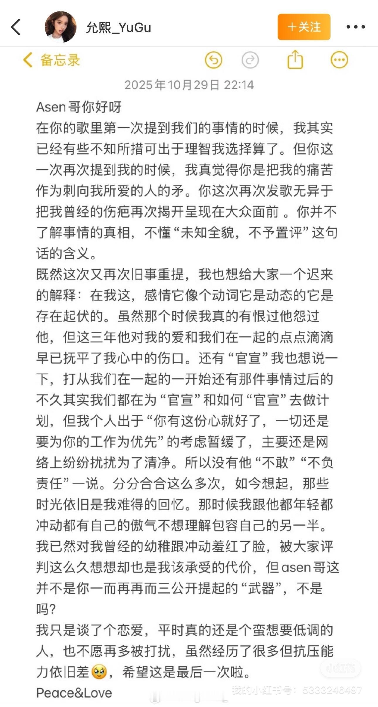 杨和苏前女友允熙回应asen 杨和苏前女友允熙再度发声,表示: