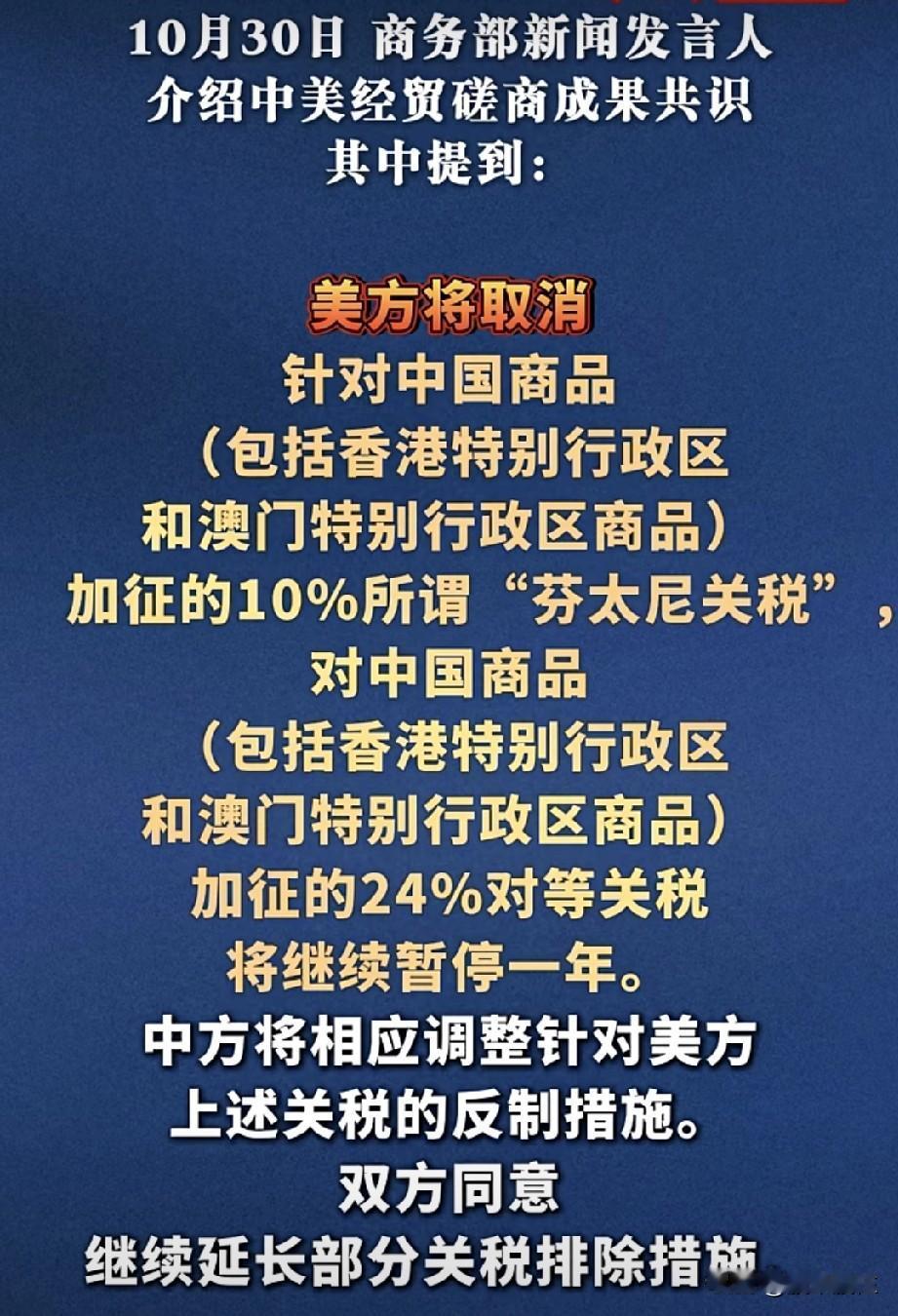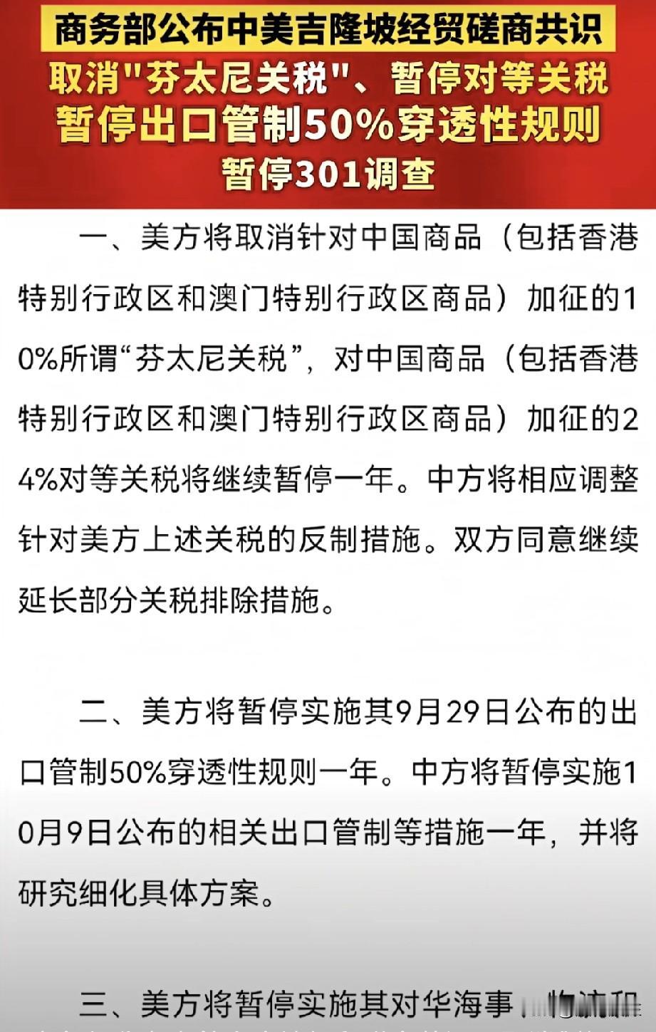 艹🌿! 虐狗🉐一天? 又是盘后发消息! 一是取消加征的10%所谓“芬太尼关税”,对我国商品加征的24%对等关税将继续暂停一年。双方同意继续延长部分关税排除措施。 二、美方将暂停实施其9月29日公布的出口管制50%穿透性规则一年。 三、美方将暂停实施其对华海事、物流和造船业301调查措施一年。 四、双方还就芬太尼禁毒合作、扩大农产品贸易、相关企业个案处理等问题达成共识。美方在投资等领域作出积极承诺,中方将与美方妥善解决TikTok相关问题。 消息发布后,港股迅速拉升后震荡,会谈结果可以说是双方及时止损,有积极的向好的方向发展,还得看美方是否言行一致,落实会谈共识。谈大门打开,打奉陪到底。 今天大A放量1736亿元,所有指数都下跌,创业版1.84领跌。4100只票下跌。主力利用证券打压大盘指数,导致市场情绪降温,加之会谈结果未公布,市场选择先跌为敬。今天诡异的的是1点开盘后迅速砸盘15分钟,成交量迅速放大。1点16分到1点40分拉回后,一路下杀到尾盘。有多少人交出筹码了? 明天看反弹,从盘后公布的消息来看,会谈结果是好的。对于美联储降息25个基点,我们这边会不会降呢?今天反人性的操作会不会在明天又给股民预期差呢?