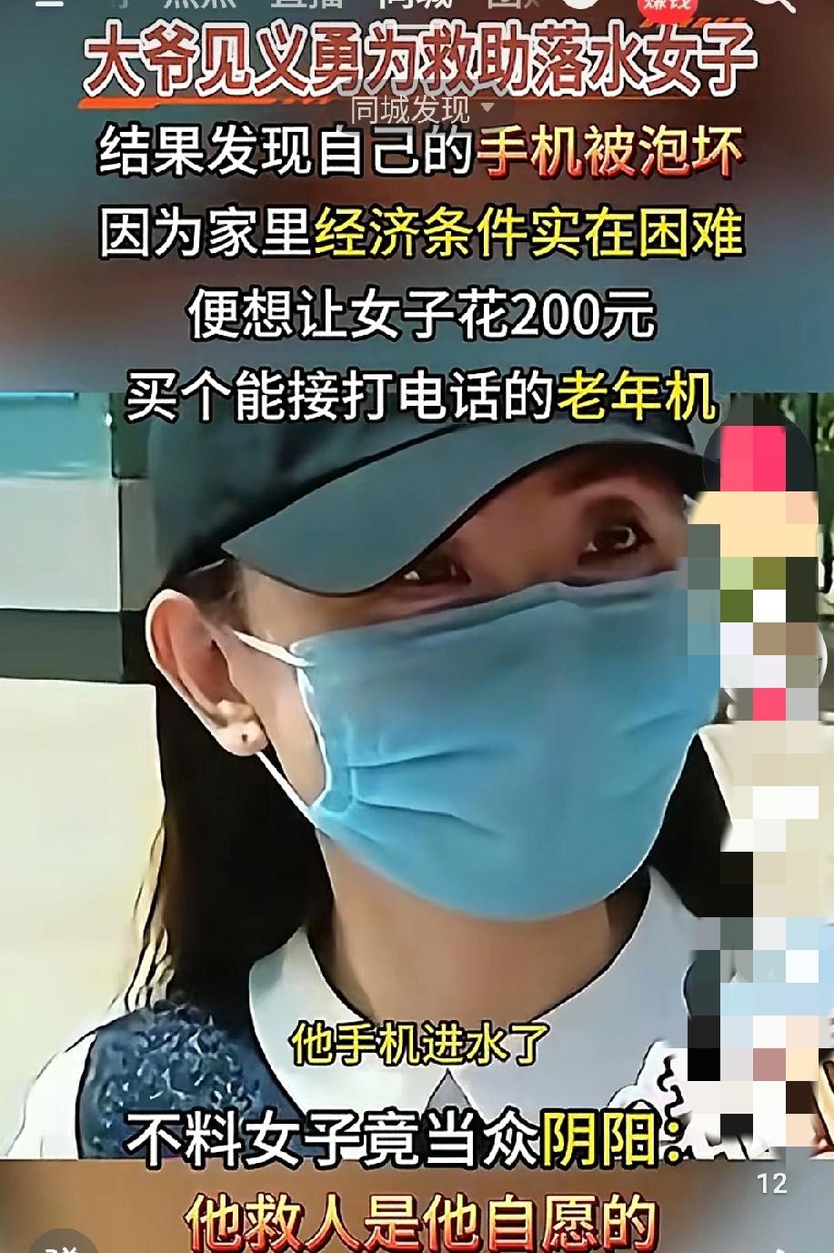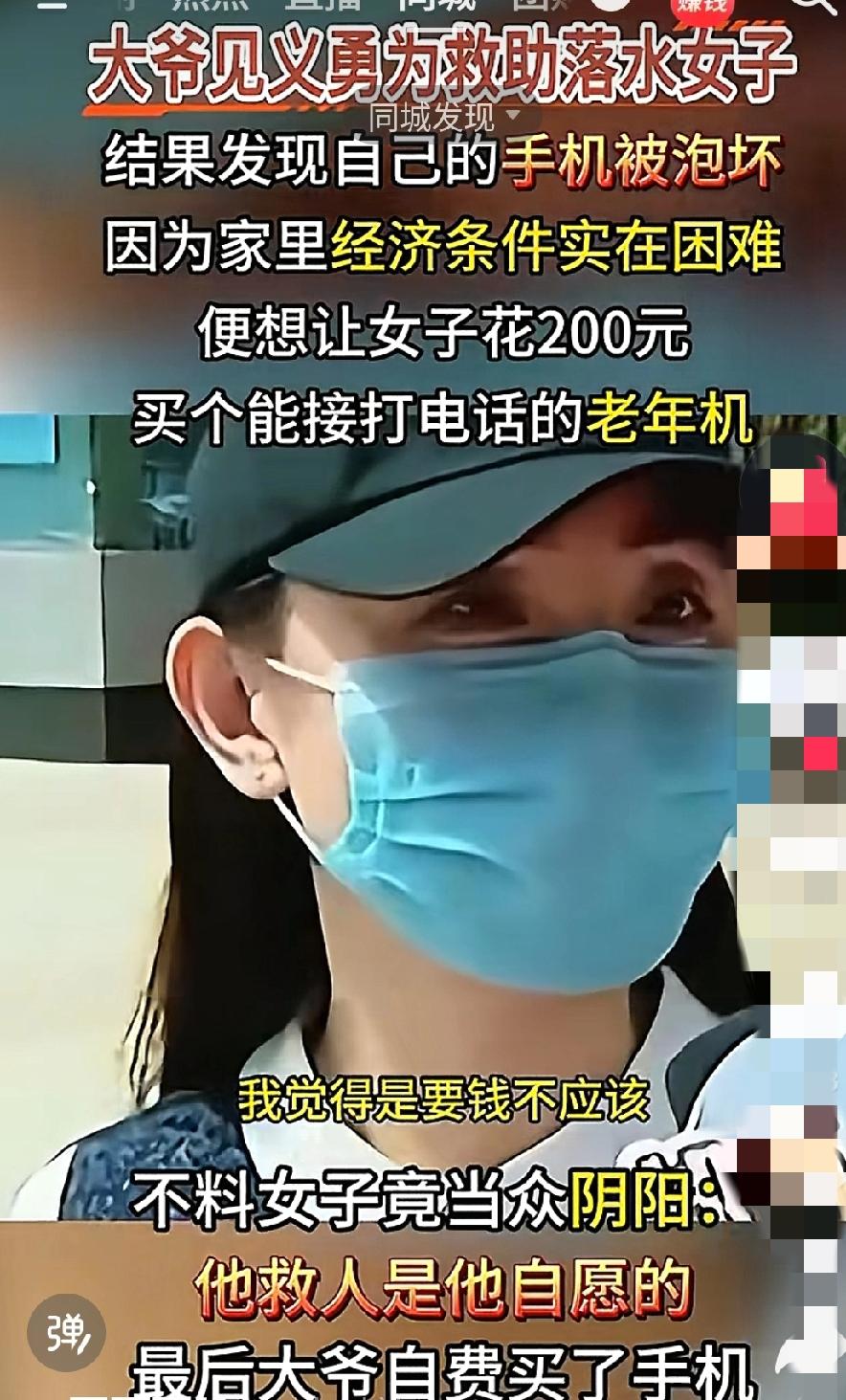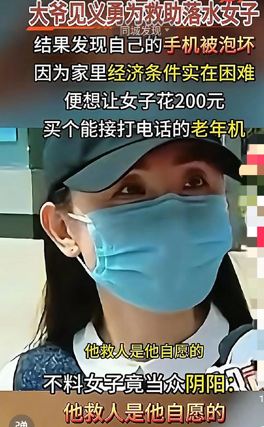 东郭先生与狼的故事越来越多!大爷救了落水女子,手机被水泡坏了。想让女子给买个老年