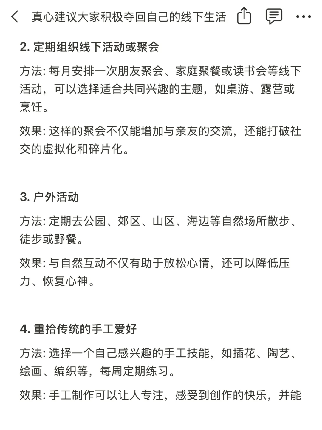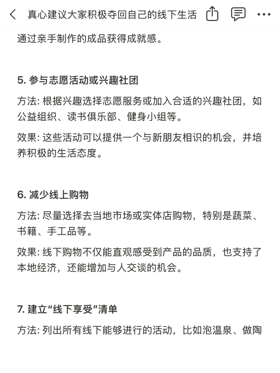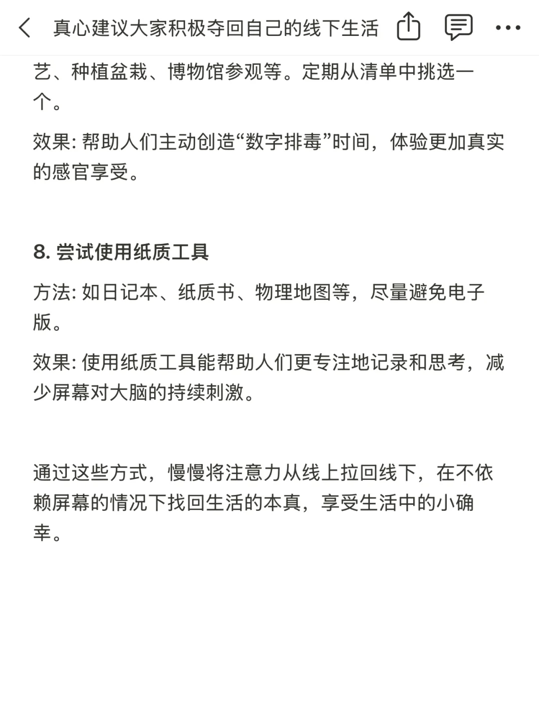 ✅具体怎么做给大家分享在图上了,通过这些方式,慢慢将注意力从线上拉回线下,在不依赖屏幕的情况下找回生活的本真,享受生活中的小确幸。