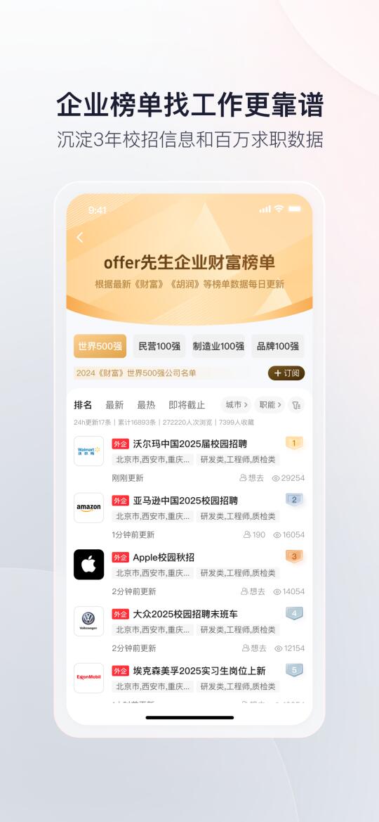 不知道怎么选公司,可以查看用户求职榜单,根据用户行为,统计出最高人气榜、最想入驻榜、热评榜和订阅榜;offer先生也会随时关注《财富》、《胡润》等企业榜单,整理最新的企业榜单