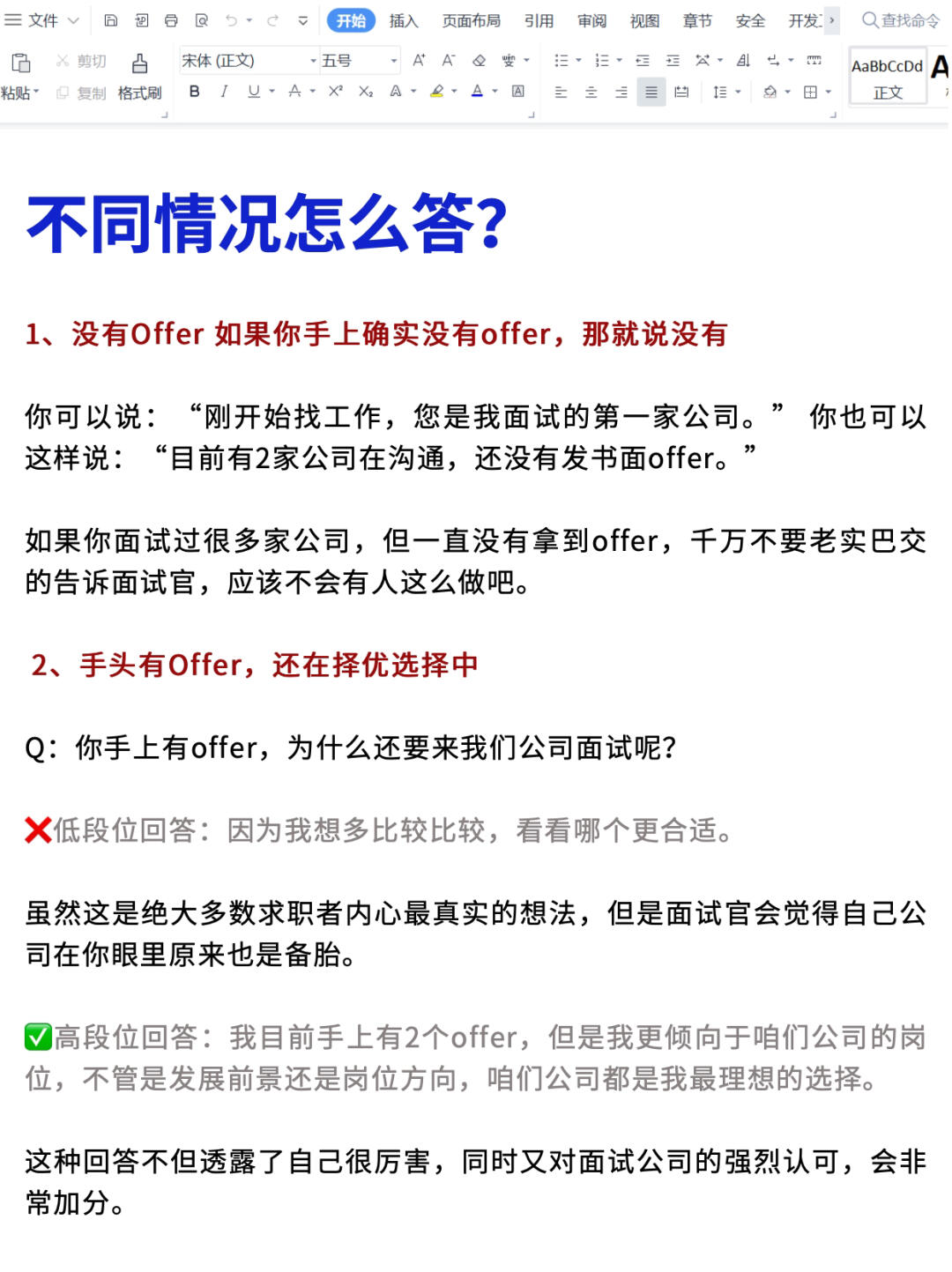 高段位回答:我目前手上有2个offer,但是我更倾向于咱们公司的岗位,不管是发展前景还是岗位方向,咱们公司都是我最理想的选择。