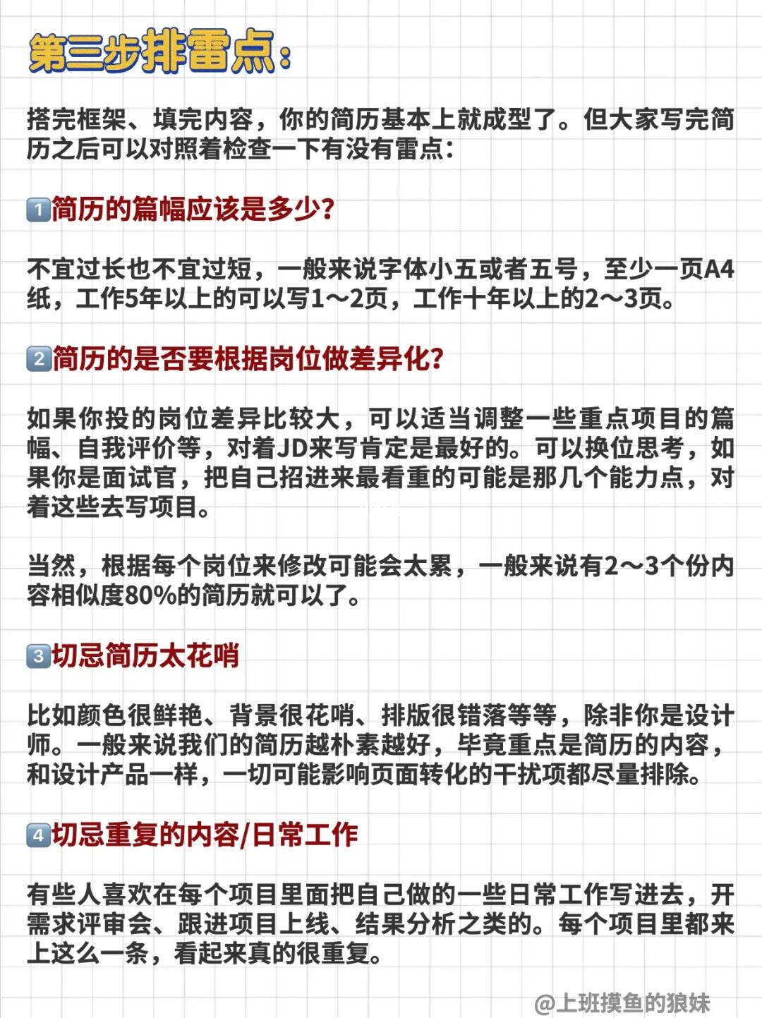 搭完框架、填完内容,你的简历基本上就成型了。我在图中列了一些常见问题和雷点,大家写完简历之后可以对照着检查一下。