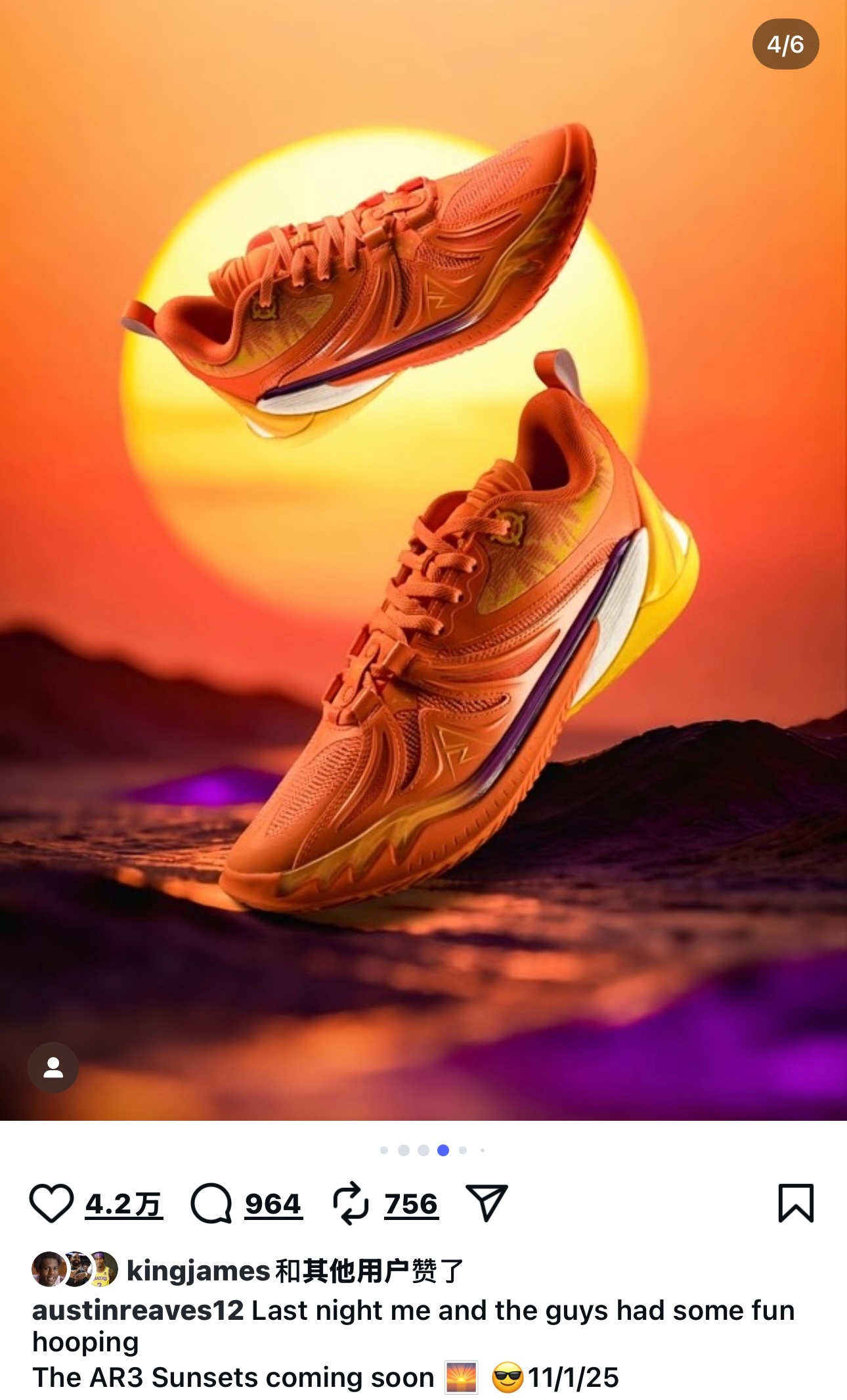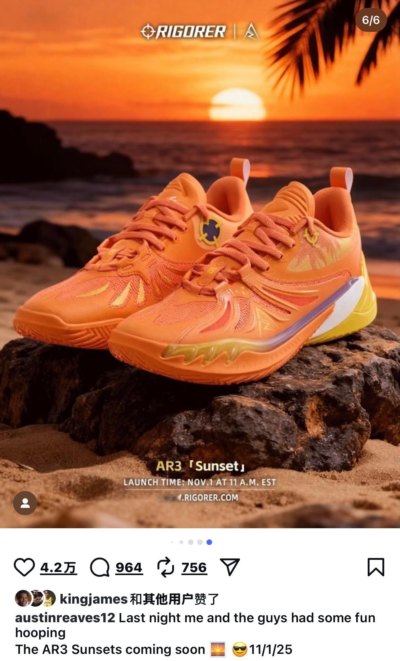 里夫斯今天更新INS:昨晚我和大家打了一场很有趣的比赛。AR3日落🌅系列即将上