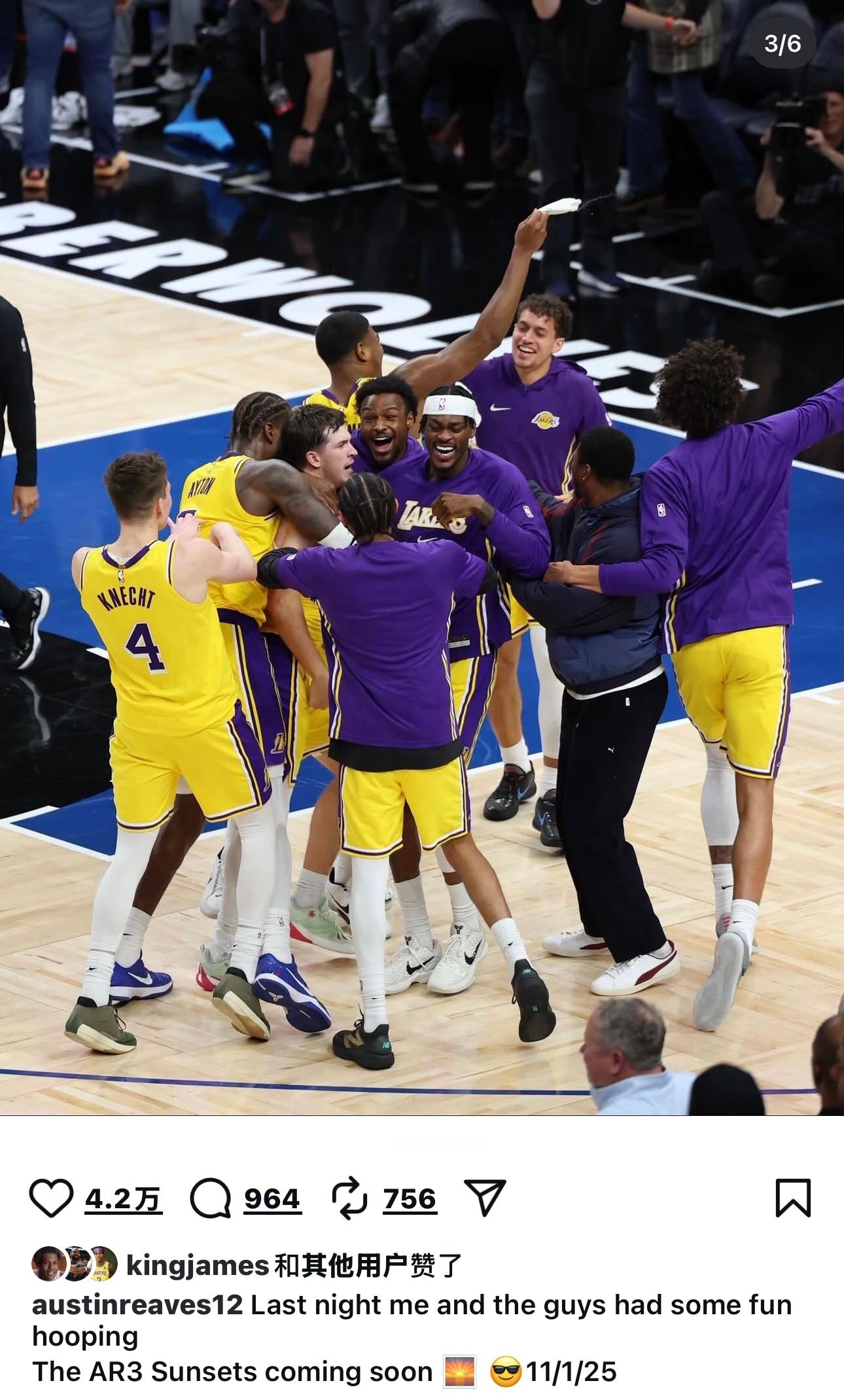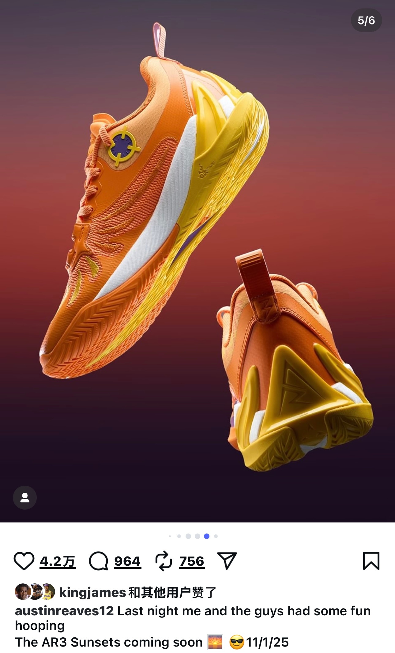 里夫斯今天更新INS:昨晚我和大家打了一场很有趣的比赛。AR3日落🌅系列即将上线[酷]