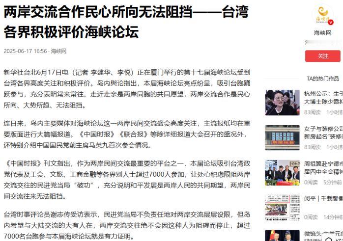 台湾省媒体人陈凤馨表示,按照民调来看,70%以上的台湾地区民众是接受自己是中华民族的一份子的,可是对于统一这件事,真正的疑虑是在于制度的不同,担心生活方式会出现剧烈的改变。所以现在大陆是去强调生活方式不变,但她还是比较相信民间交流。   她提到的这一民调结果,恰恰点出了两岸血脉相连的根本,这种认同不是政治口号堆砌的假象,而是刻在文化基因里的联结。   但统一议题上的疑虑确实戳中了现实中的隔阂,制度差异带来的生活方式担忧,成了横在共识面前的一道坎。   大陆方面其实早有回应,国台办明确表示和平统一后台湾现行社会制度和生活方式会得到充分尊重,私人财产、宗教信仰等合法权益都有保障,还陆续出台“31条措施”“26条措施”等政策,为台胞在大陆学习、创业、就业提供同等待遇,这些举措都在传递“生活方式不变”的信号。   但在陈凤馨看来,这些政策的温度,终究要靠人与人的接触才能真正传递到台湾民众心里。   她跑两岸新闻二十多年,早在上世纪90年代跟台商打交道时就发现,那些往返两岸的老板常跟她说“在大陆做事踏实,政策稳当”,这让她更早意识到两岸误解多源于“未见”。   就像她在节目里常提的台北姑娘小琳,早年到厦门求学时总担心“不习惯”,结果不到半年就迷上了鼓浪屿早市的沙茶面,说比台北夜市的更够味;毕业后留在当地做设计,去年带父母打卡张家界,老两口回来逢人就夸大陆高铁比飞机稳,景区服务比想象中贴心。这样的故事远比空洞的政策解读更有说服力。   民间交流的效果早有数据佐证,台湾《联合报》曾做过调查,去过大陆的台湾民众里,68%都表示对统一的疑虑有所减少,其中年轻人占比最高。   这背后是两岸交流热潮的真实支撑,2024年台湾同胞赴大陆人次达到402.3万,同比增长54.3%,就算民进党当局层层设限,第十七届海峡论坛还是吸引了超过7000名台胞参与,累计十六届论坛更是有35万余人次两岸同胞相聚,其中台湾同胞超14万。   体育领域的交流更接地气,台湾球迷组成“台湾村超粉丝足球队”赴贵州榕江参赛,在全民狂欢里感受足球的纯粹快乐;第二届海峡两岸同名村“村BA”篮球邀请赛上,24支宗亲队伍在呐喊声中深化宗亲情谊;还有台胞赶场打卡“苏超”“浙BA”,在“看球+美食+美景”的体验里,发现两岸生活方式的共通之处。   这些场景里没有复杂的政治论述,只有运动的激情、美食的诱惑和宗亲的温情,却悄悄消解着“生活方式差异”的刻板印象。   民进党当局总炒作“大陆会改变台湾”,可那些真去过大陆的人都清楚,台湾人爱喝的珍珠奶茶在大陆街头随处可见,喜欢骑的机车在厦门、泉州老街上照样跑得自在,所谓“生活方式剧变”不过是刻意制造的恐慌。   陈凤馨推动的“两岸学生笔友计划”更藏着细腻的考量,她知道民进党多年的“信息过滤”让不少台湾家长心存顾虑,担心孩子接触大陆后“不适应台湾”,而让台湾小学生和大陆孩子互寄阿里山明信片、故宫书签,反而能绕开成人世界的偏见。   去年有个台湾小朋友收到大陆笔友寄的冬奥会纪念徽章,特意让妈妈带他看直播,看完说“原来大陆也有会滑冰的小朋友,跟我一样喜欢堆雪人”,这样的瞬间恰恰是民间交流的魔力——不用讲大道理,只用童真的视角就能打破误解。   当然交流之路从不是坦途,民进党当局一边污名化海峡论坛,一边限制台湾学生赴大陆交流,还宣称“会被洗脑”,可这种阻挠在民心面前显得格外无力。   萧旭岑说,绝大多数的台湾同胞是非常认可这种双方的交流的,也希望两岸和平发展,台湾商业总会荣誉理事长赖正镒也直言,海峡论坛是两岸凝聚共识、创造双赢的关键桥梁。   70%的中华民族认同是两岸最坚实的基础,制度差异或许需要时间沟通,但生活方式的共通性早已在民间交流中显现。   陈凤馨相信的民间交流,本质上就是用一次次见面、一碗碗热汤、一场场球赛,把“担心改变”变成“习惯共处”,毕竟两岸同胞本就同根同源,那些刻意筑起的“心墙”,终会在常来常往中慢慢消融。