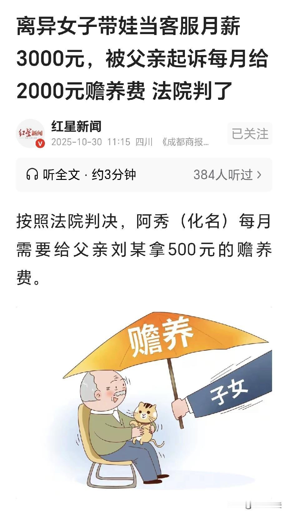 陕西西安,一女子是单亲妈妈,独自带女儿生活,她在灯具厂做客服,每月工资3000元,女子父亲63岁,退休工资每月2000元,女子万万没有想到,父亲将她告到法院,要求女儿先支付他赡养费医疗费71500元,今后每月再给他赡养费2000元,女子大哭: 是爷爷奶奶养我长大,法院这样判了! 1992年,男子刘某和女子朱某某结婚,不久,朱某某生下了女儿阿秀。 起初几年,日子还算凑合,可时间一长,夫妻渐渐有了矛盾。 刘某脾气不好,只知道在家里耍横,朱某某忍气吞声,勉强忍到了阿秀6岁。 家里又穷,丈夫又对自己不好,朱某某已经忍无可忍,她抛下阿秀,自己跑了。 阿秀没了妈妈,日夜啼哭,可是母亲自顾自走了,再不见回来看过阿秀。 转眼又过去了4年,刘某带着阿秀,他心里烦透,太拖累自己,他二话不说,拉着阿秀,把她送到了爷爷奶奶家里。 老人看阿秀可怜,赶忙把孙女留了下来,好在老人疼爱孙女,一直将她抚养长大。 阿秀长大之后,她懵懵懂懂,又结婚嫁人,本以为从此以后,就有了自己的家和归宿。 结婚之后,她也生下了女儿,看着女儿,阿秀想起来自己小的时候,她暗自发誓,绝不让女儿再受自己小时候的苦。 谁知婚后不久,阿秀发现,丈夫也不靠谱,对她也不似从前那般疼爱,她渴望的幸福婚姻,根本就是她一厢情愿。 阿秀对婚姻大失所望,既然俩人过不到一起,阿秀选择了离婚,她带走了女儿,几乎就是净身出户。 阿秀不争财产,她只要带着女儿就好,她无论如何,不会像自己的母亲那样狠心,抛下自己独自走了。 离婚之后,阿秀四处寻找着工作,可是她没啥文化,最终在一个灯具厂做了客服。 阿秀的工资每月3000元,勉强够她和女儿的生活。 尽管生活如此的艰难,阿秀依旧感到非常的幸福,只要女儿在自己身边,她的生活就有了奔头。 阿秀父亲刘某逐渐的老去,他已经63岁,身体状况非常不好。 他年轻的时候,几乎没有关心过阿秀。 如今他老了,这才想起来还有阿秀这个女儿。 刘某如今已经退休,退休金大概2000元左右,他还有一些补贴,完全能够维持生活。 谁知去年年底,他身体不适,住进了医院,医疗费花了不少,可把他心疼坏了。 这个时候,他想起来了阿秀,刘某心想,有句老话叫养儿防老。 阿秀虽然只是个女儿,可她也有赡养父母的责任,如今她已经长大成人,还有工作,也有收入,赡养老人是她的义务! 老刘心想,自己的医疗费应该由她来出!他一纸诉状告到了法院,要求阿秀支付他2022年2月~2024年11月期间的赡养费医疗费共计71500元。 他还要求,要阿秀从2024年12月起,每月支付他赡养费2000元,以及他今后的医疗费,全部都由阿秀承担。 阿秀收到法院的传票,顿时懵了,她对父亲,只有10岁前的记忆,自己是被爷爷奶奶养大,父亲的影子,早就在10岁那年开始模糊。 阿秀认为,自己只有6到10岁,跟着父亲生活,那个时候,父亲只给她100元生活费。 10岁之后,父亲就把她扔给了爷爷奶奶,是爷爷奶奶养育她长大成人,父亲对她没有完全尽到抚养责任。 再加上自己离婚,带着个女儿,每月工资只有3000元。 她离婚时,也没有分到财产,前夫也不按时给女儿的抚养费。 父亲张口就要这么多钱,自己根本就无力支付,自己实际情况就是如此,父亲有退休金,他完全可以养活他自己。 对于阿秀来说命运坎坷,儿时父母对她不管不问,好不容易挨到成年,之后结婚又离婚。 人生两个本应该最爱她的男人都辜负了她,还欺负她,希望她能坚持,把孩子养大。 那么,这件事在法律上是怎么认定的呢? 《民法典》第1067条规定: 成年子女不履行赡养义务的,缺乏劳动能力或者生活困难的父母,有要求成年子女给付赡养费的权利。 法院认为,刘某身患多种疾病,劳动能力受限,生活上有困难,阿秀作为成年子女,依法负有赡养义务。 赡养义务不以父母是否完全尽到抚养义务为前提,子女赡养父母的义务系基于身份关系产生,是法定的、无附加条件的,不能轻易免除。 一审认为,阿秀不能以父亲未完全履行抚养义务为由,拒绝履行赡养义务。 确定赡养费标准时,需综合考虑当地的生活水平、父母的实际需求以及子女的经济能力等因素。 一审法院根据刘某的身体状况、实际生活需求、当地生活水平等因素,判决阿秀自2025年6月起,每月支付刘某500元赡养费。 该金额符合保障老年人基本生活需求的原则,亦未明显超出阿秀的一般负担能力范围。 这笔费用包含刘某的医药费。对于刘某其他的诉求,法院驳回。 阿秀不服,提起上诉,自己离婚带女儿,每月工资3000元整,请求法院改判每月支付父亲赡养费300元。 二审法院认为,一审判决阿秀每月给刘某500元赡养费并未畸高,也在阿秀的承受能力之内。 二审驳回上诉,维持了原判。 关注@王哥说法 多学法律少吃亏!
