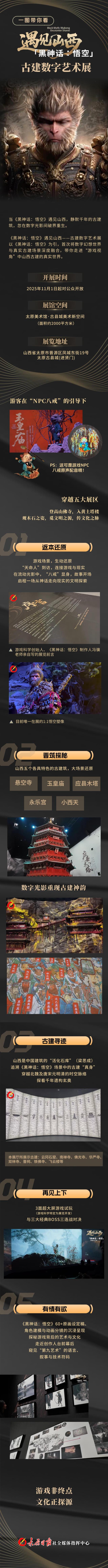 《黑神话:悟空》遇见山西——古建数字艺术展,将于11月1日在太原美术馆·古县城美术新空间开展。该展览由游戏科学官方授权,以《黑神话:悟空》为引,首次将数字幻想世界与真实古建场景深度融合,是全球少有的“游戏+古建”数字展。本次展览如何设置、有何亮点?一图带你提前了解。