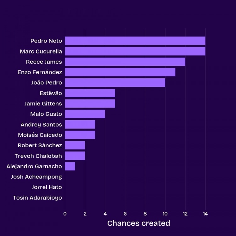 直播吧10月31日讯数据机构squakwa统计了本赛季切尔西队内的英超创造机会情况,库库雷利亚和内托并列居首。