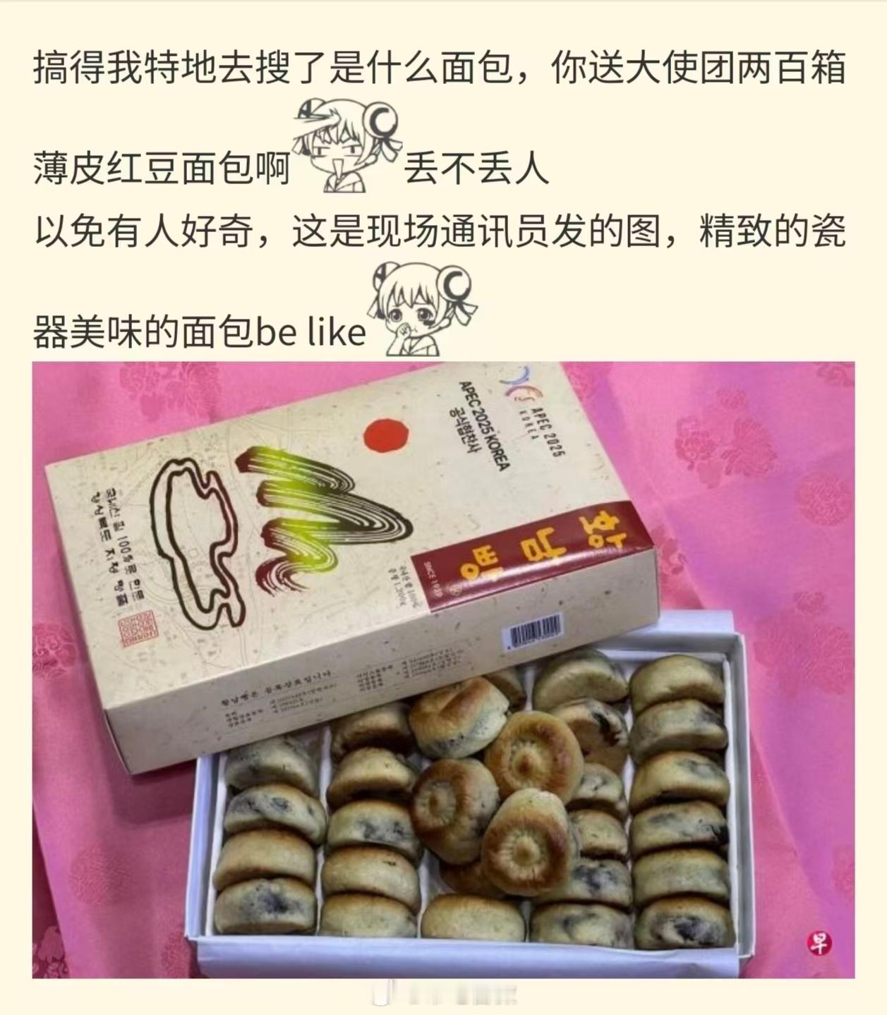 韩国送了200箱豆沙小面包(不足百年的“传统美食”),客气话这一块真是给足了。⭐