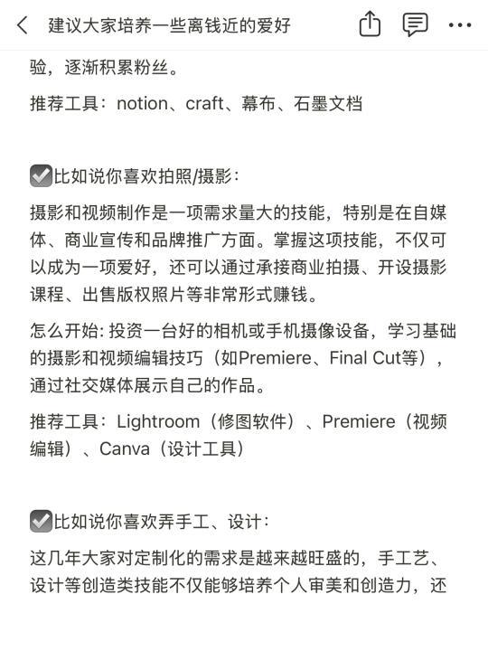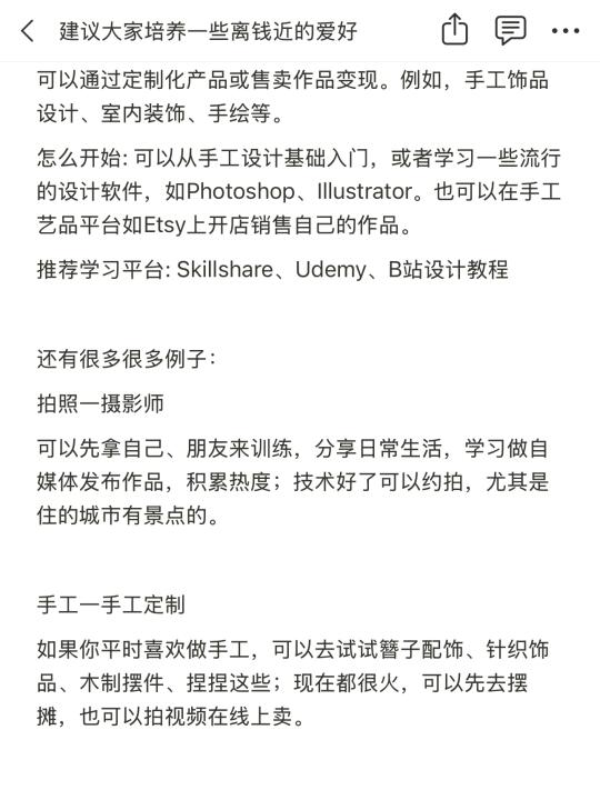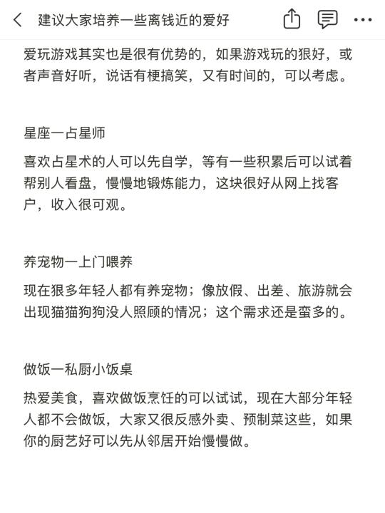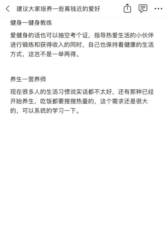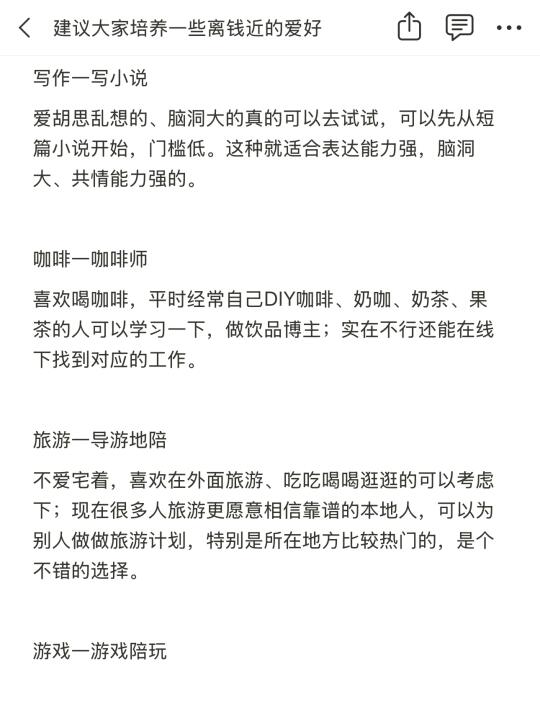 建议大家都去培养一些“离钱近”的爱好,通过爱好不仅能获得一些乐趣,还能潜在地帮助你发展技能,提升个人经济独立性,打开更多职业和财务上的可能性,好处其实是非常多的。 . 拍照一摄影师 手工一手工定制 写作一写小说 咖啡一咖啡师 旅游一导游地陪 游戏一游戏陪玩 养宠物一上门喂养 做饭一私厨社区盒饭 健身一健身教练 养生一营养师 . 不仅是个职场博主,分享真实有效的信息;还会不断分享成长干货,帮助大家提升自我! .